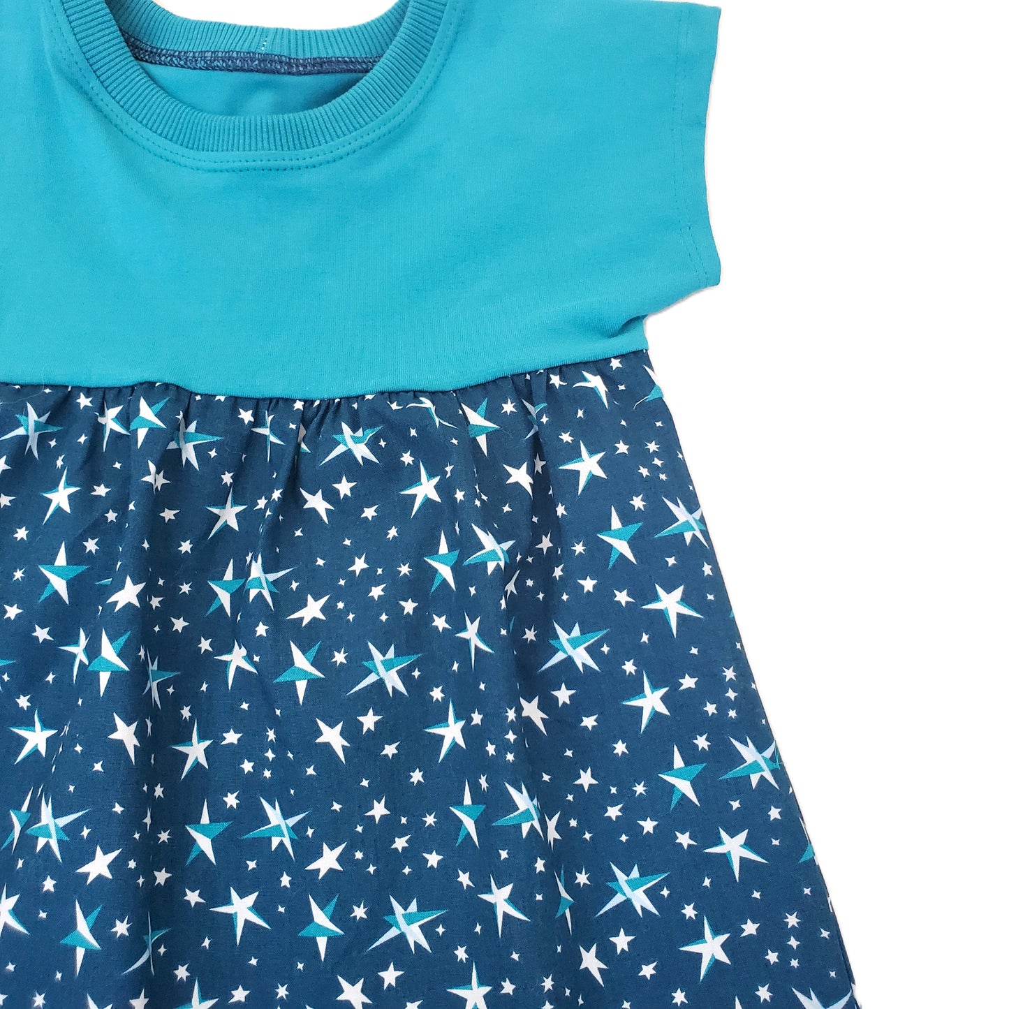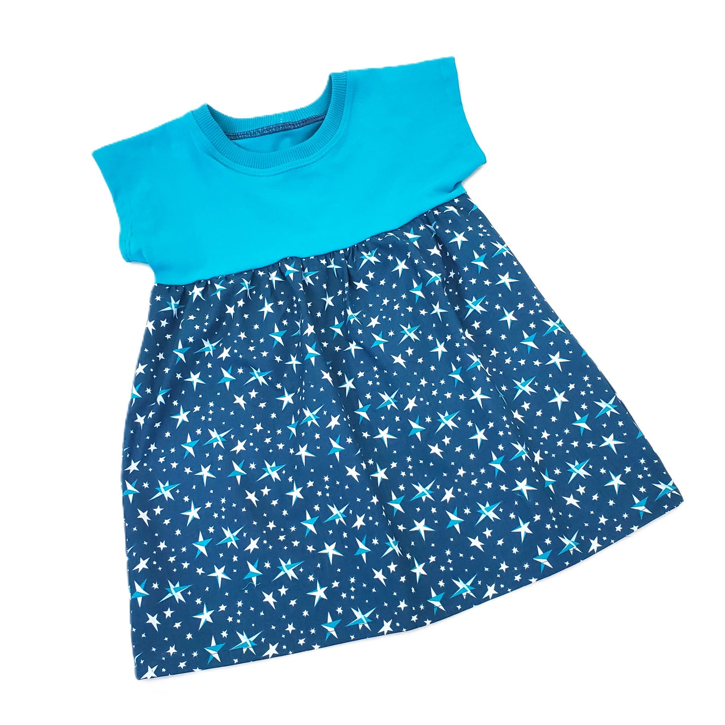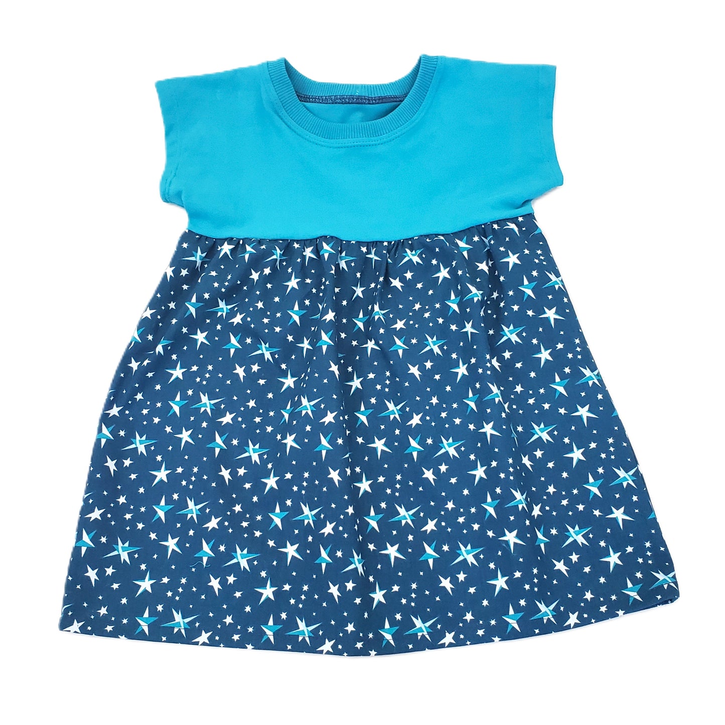 This adorable dress has a comfy, stretchy knit bodice. The gathered skirt features fabric from the beloved children's book "Goodnight Moon". And you can either add or just choose the split hem sweater as well. The sweater features a star applique.