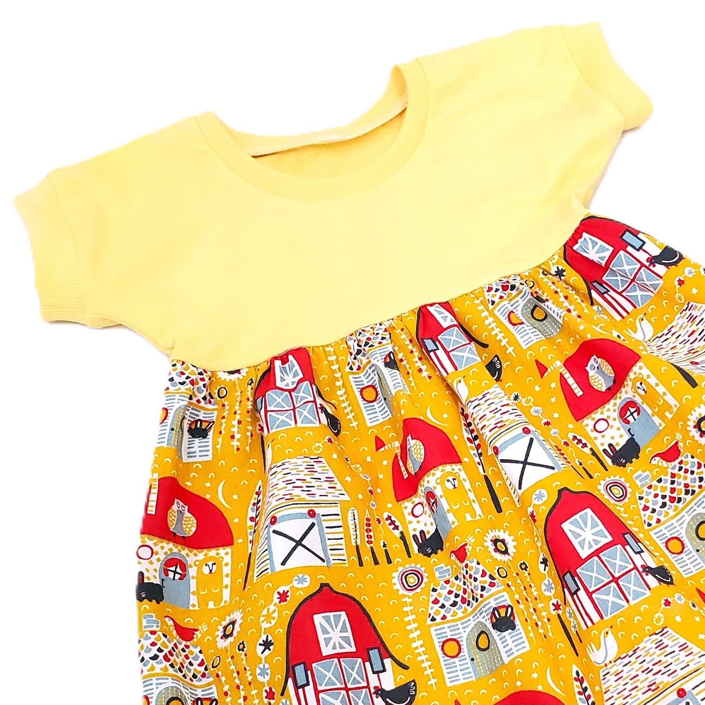 The bodice of the dress is 95% organic cotton/5% lycra jersey and the skirt is 100% GOTS certified organic cotton poplin. The sweater is french terry also in 95% organic cotton/5% lycra.
