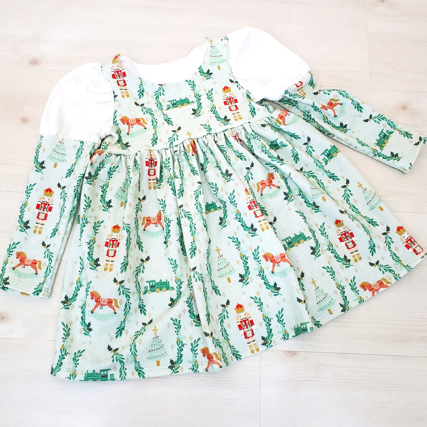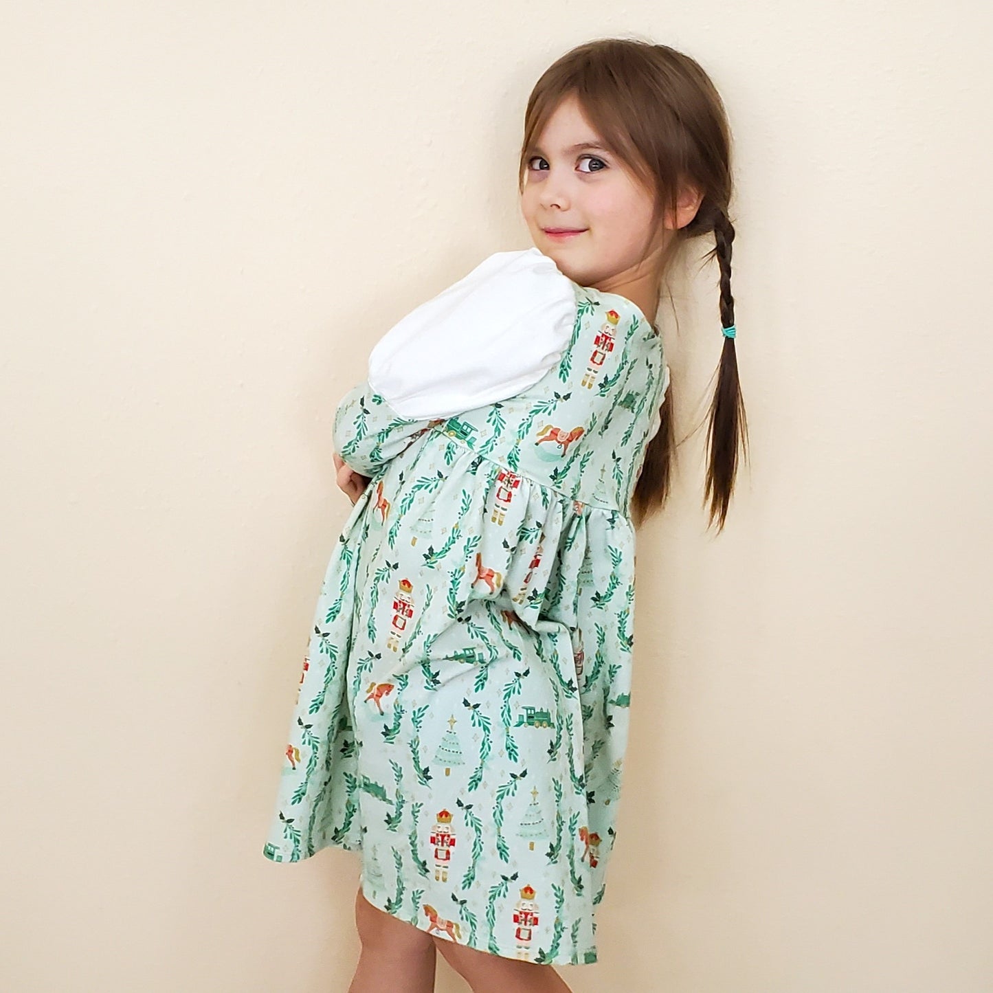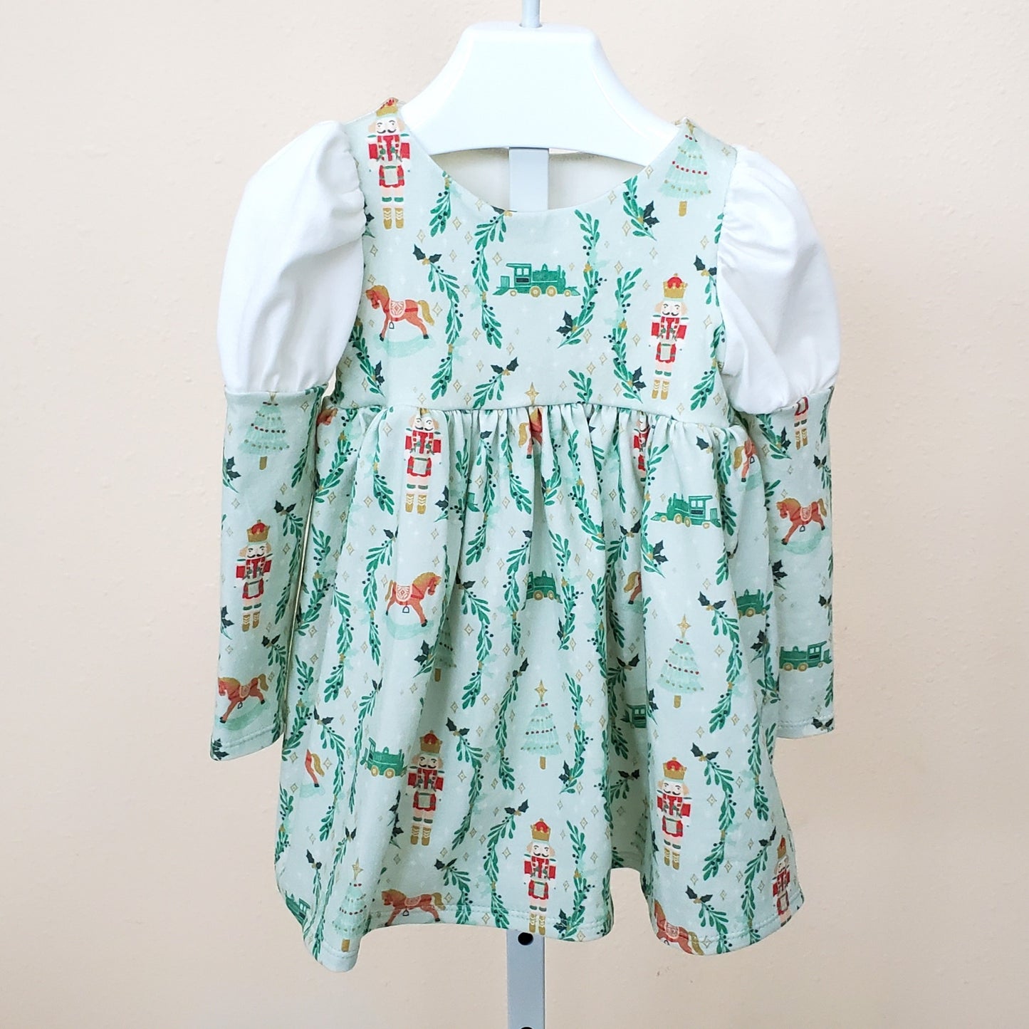 This sweet dress, with it's puffy sleeves makes the perfect holiday dress. The vintage feel fabric features nutcrackers, rocking horses, trains and Christmas trees. When the model slipped it on she said "I feel like a princess!". She is wearing a 6 and wears a size 5 so you can see it still looks wonderful sized up and that way the dress can be worn for at least another holiday season.