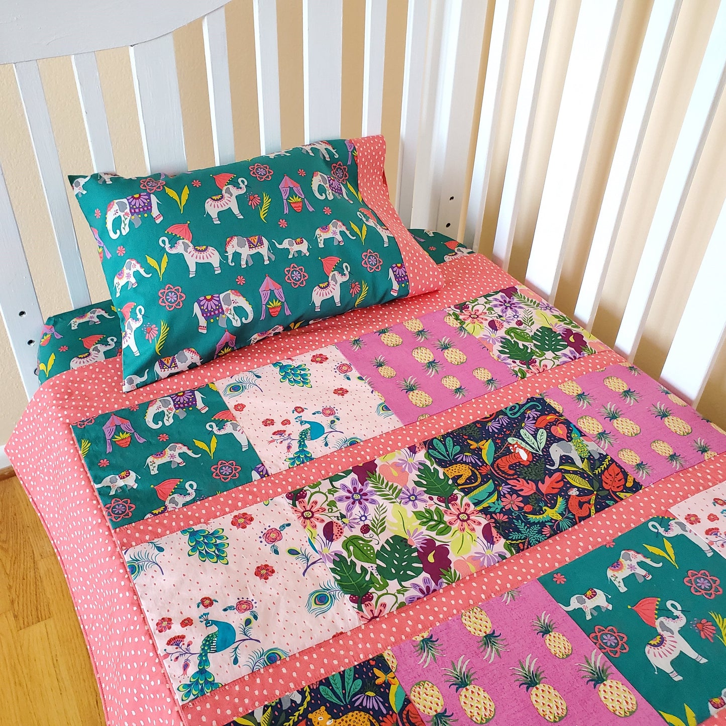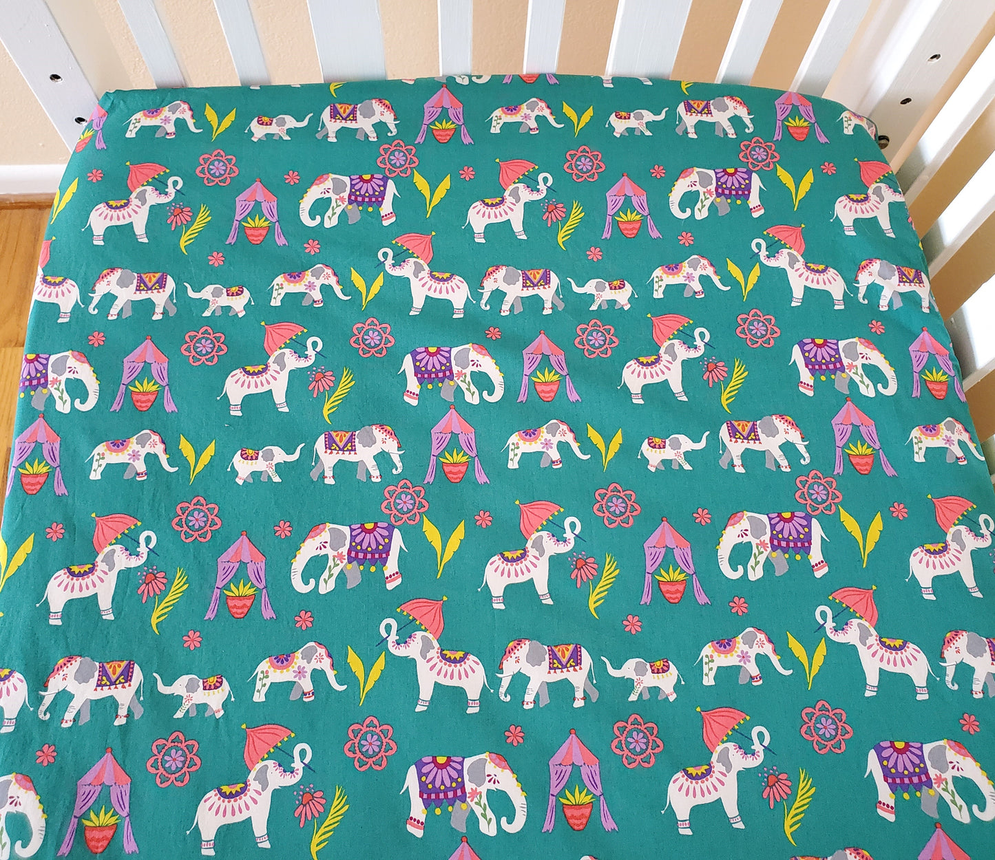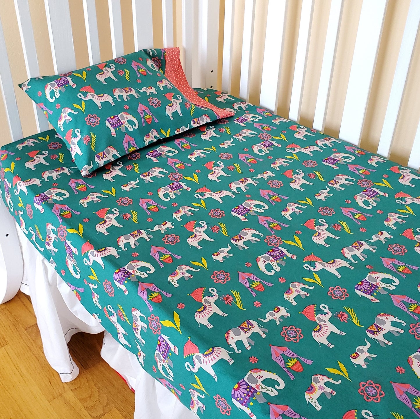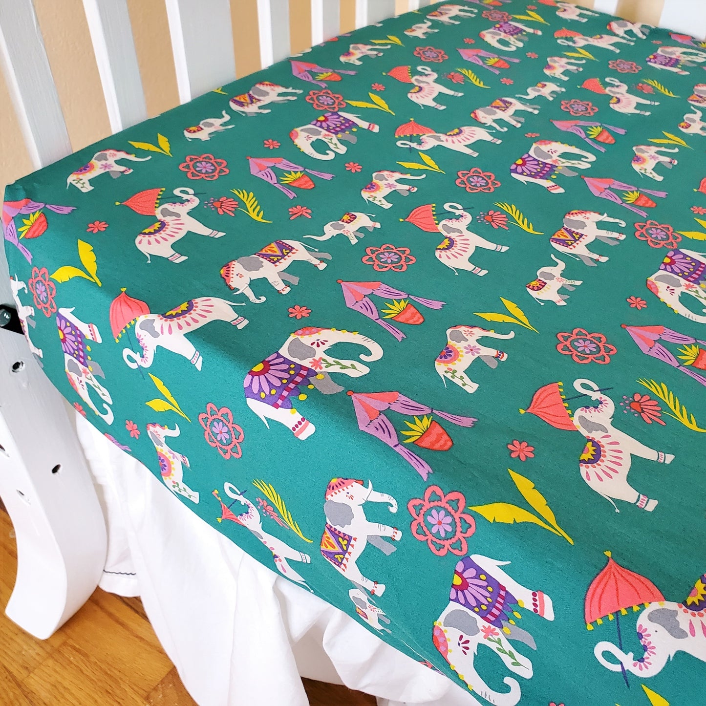 Elephants grace this beautiful jewel toned crib and toddler sheet in organic cotton.