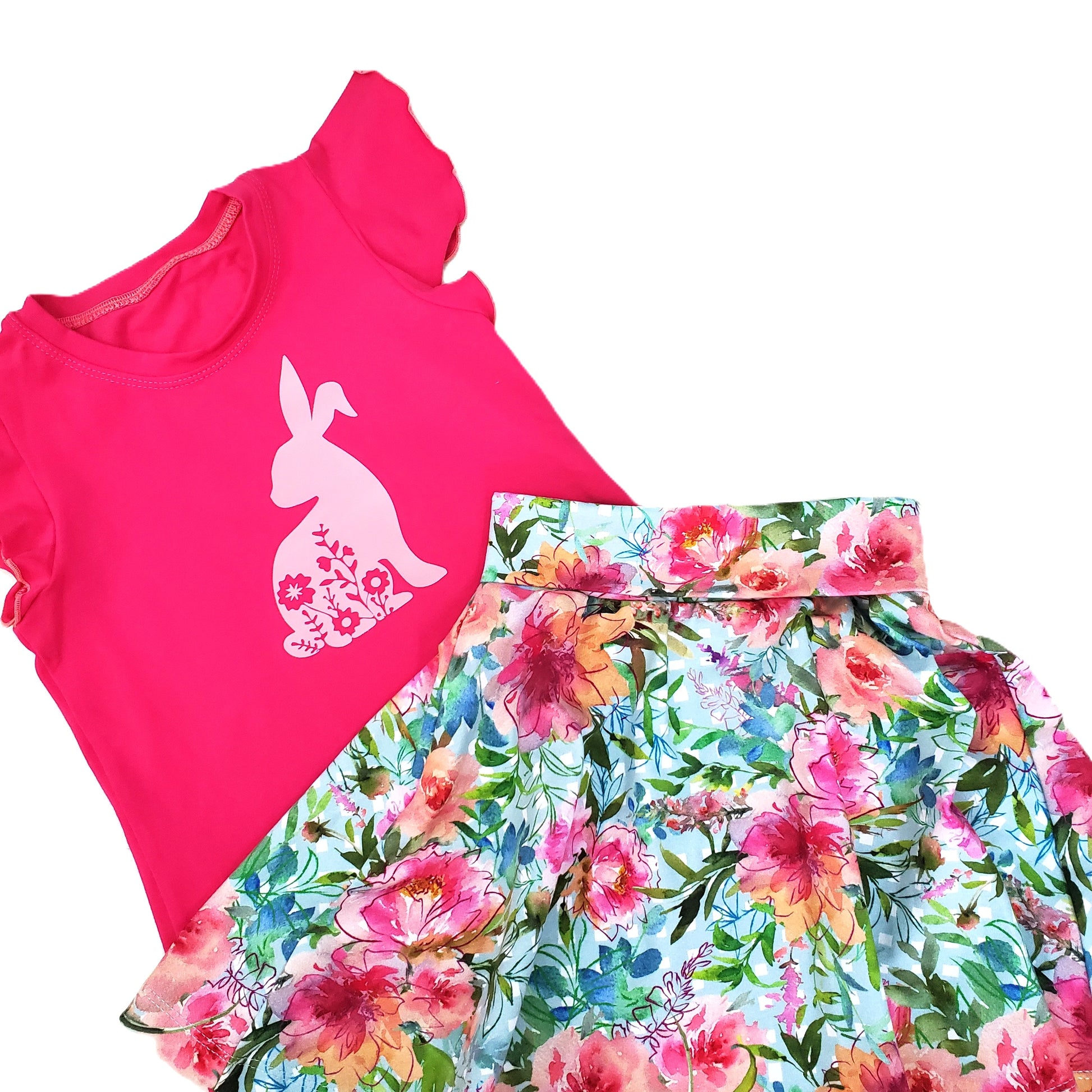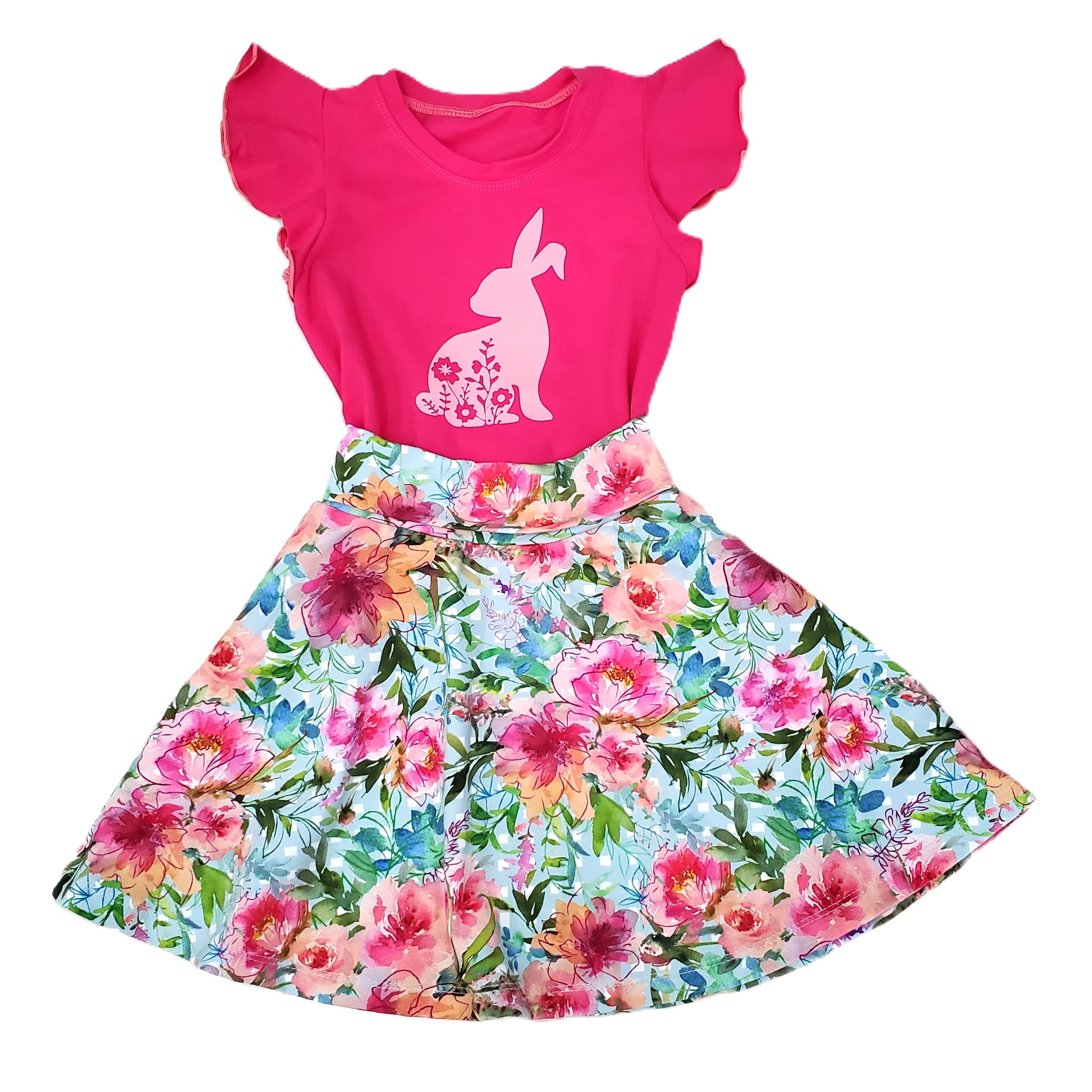 Gorgeous floral twirly skirt with a yoga waistband. This print is so vibrant and is perfect with this fuchsia flutter sleeve top with an added bunny DTF. This set is perfect for Easter and beyond.
