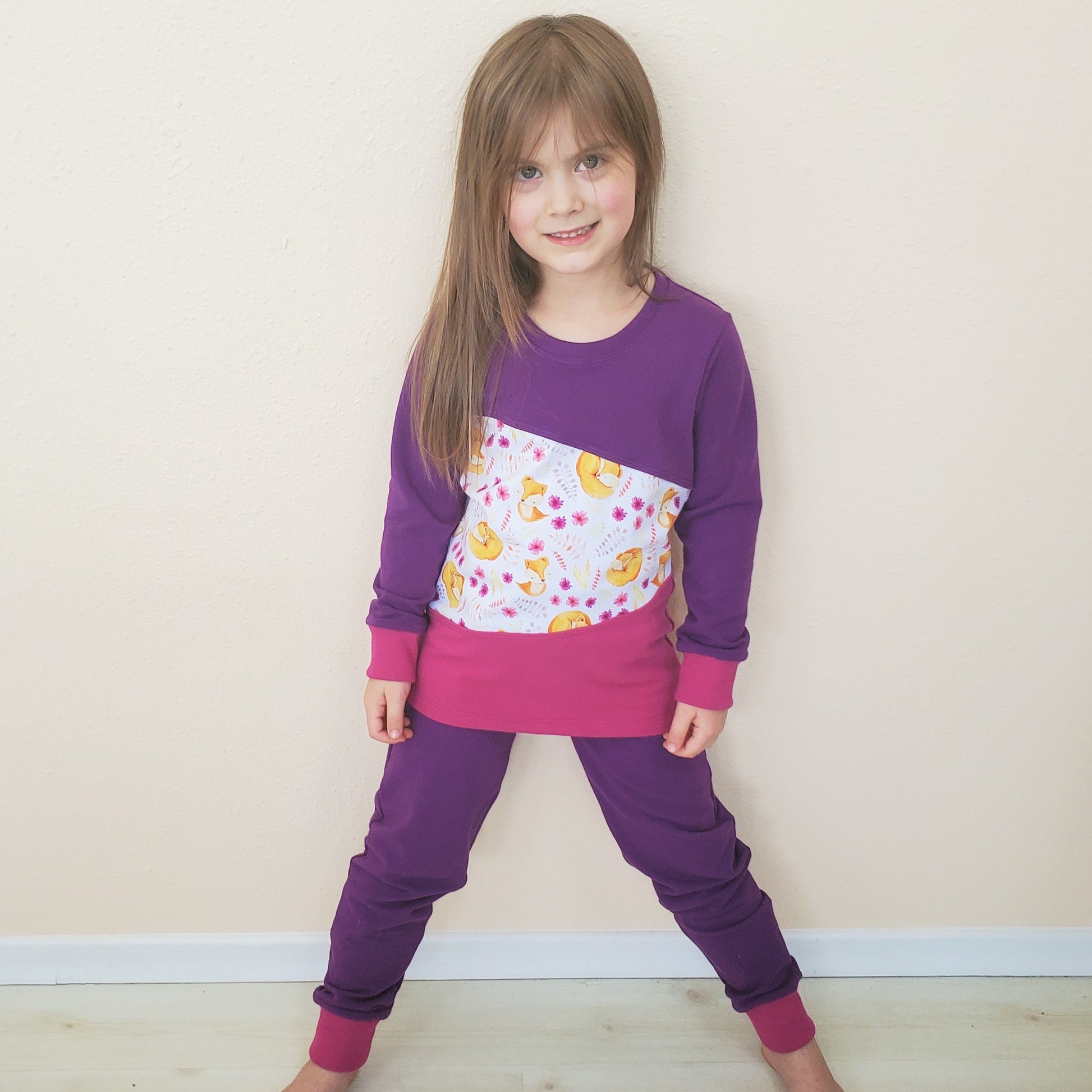 This is the cutest and coziest shirt! It features a print with a cuddly little fox and it's accented with jewel tones of fuchsia and purple.