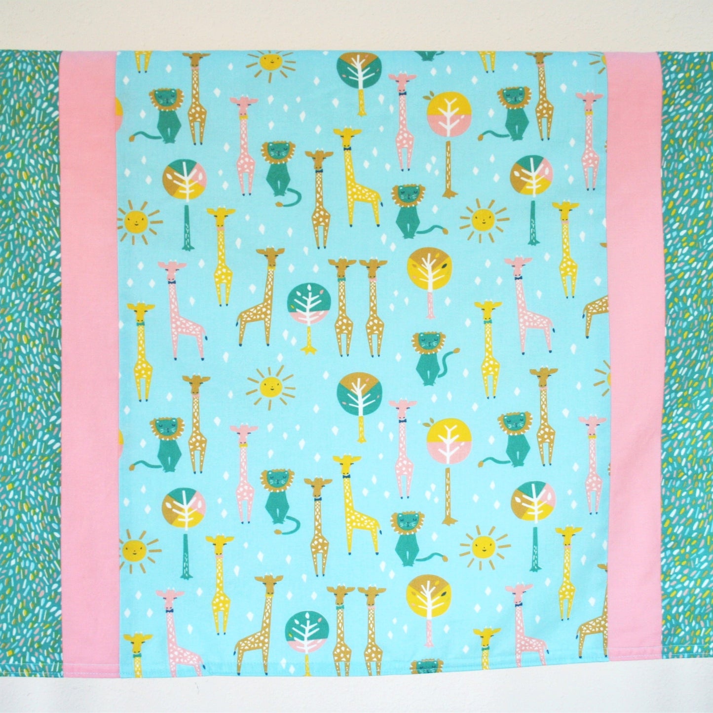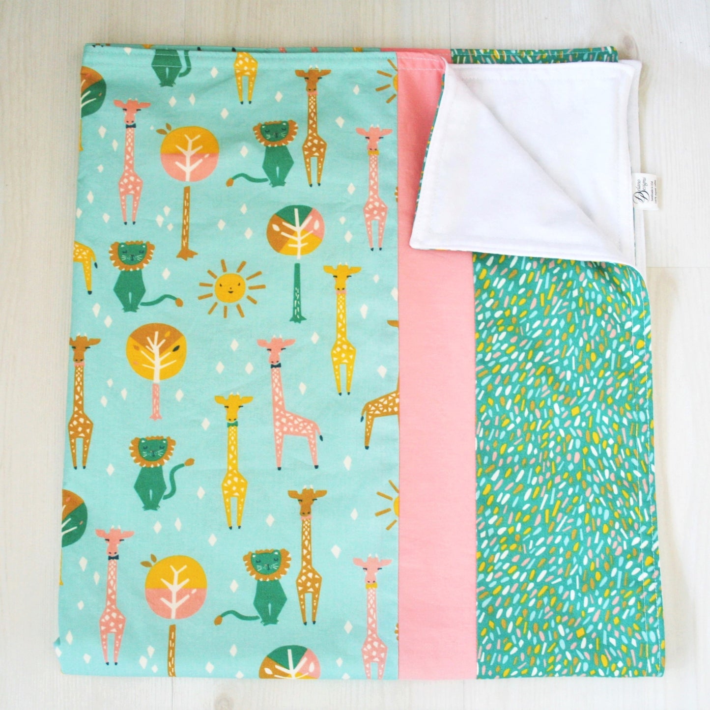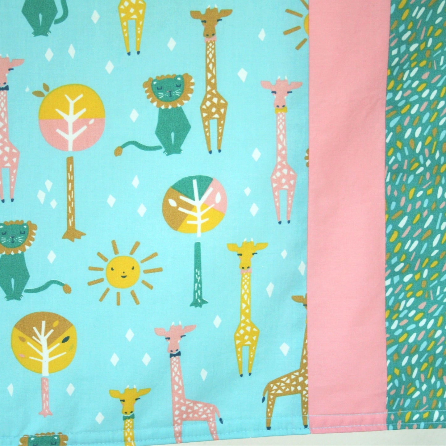 This sweet baby blanket features adorable lions and giraffes with borders of solid pink and a fun confetti print. It is backed with a soft organic white flannel.