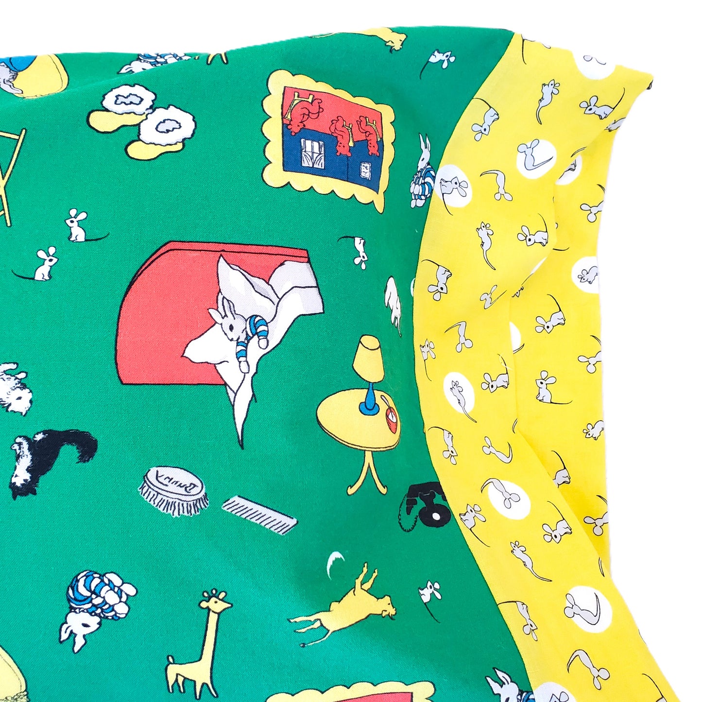 This pillowcase can be customized. There are 2 options for the main fabric, the green background with scenes from the book, or the patchwork print which has scenes in little squares. There are several options for the cuff. Just click on the fabric names in the cuff options to see the individual prints. If you want your entire pillowcase from the same print, choose it for both the main and cuff options.