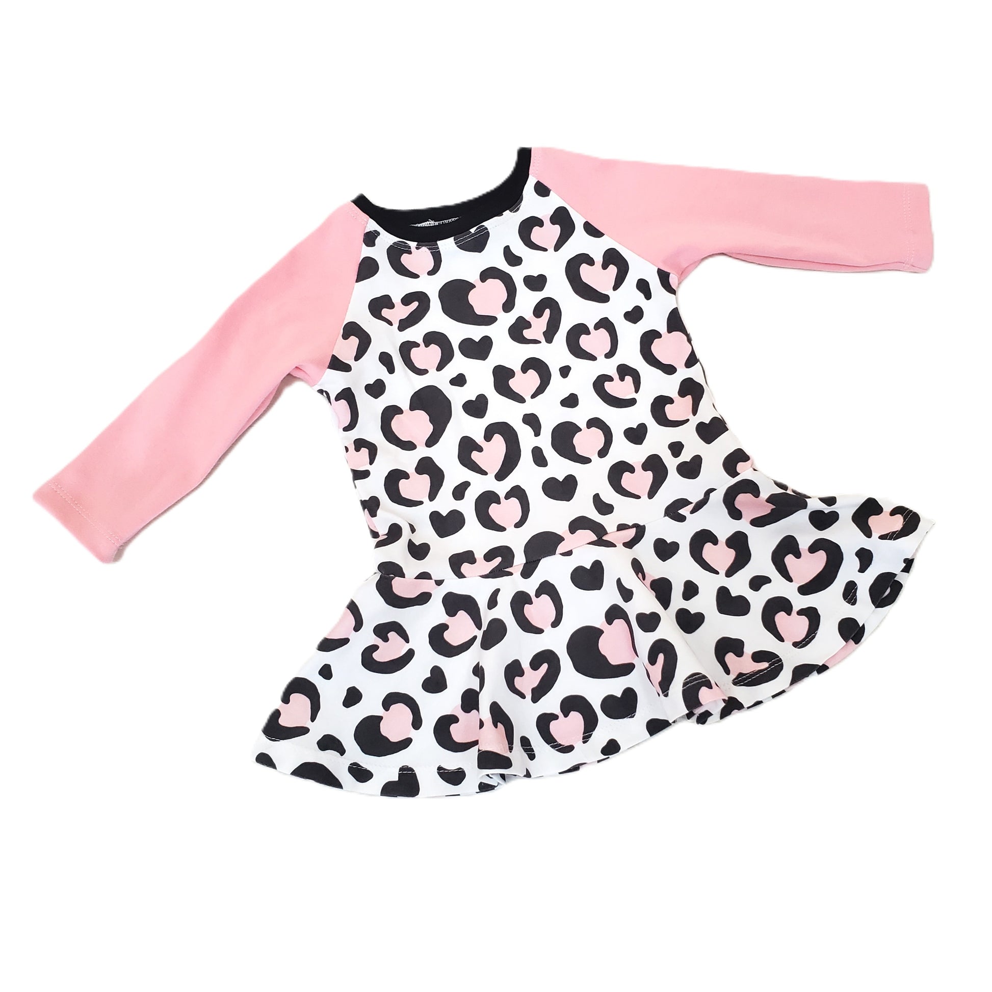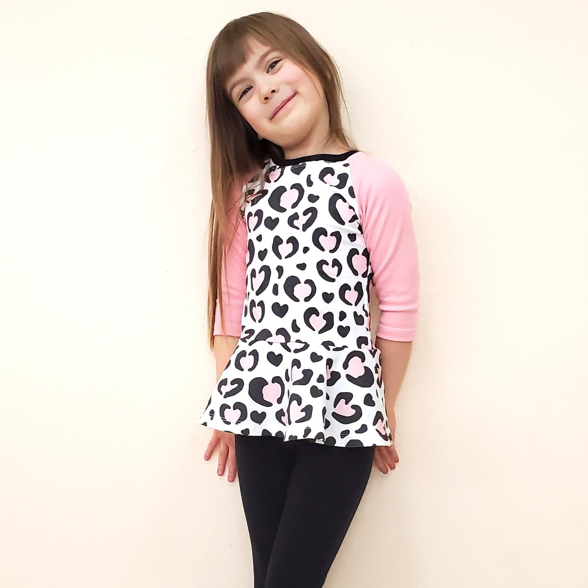 Such an adorable "animal" print peplum top with hearts, with a cropped sweatshirt also available. This set is perfect for Valentines day and will add some love to any day of the year. There is a peplum top in the print, with pink 3/4 length sleeves. There is also a sweet cropped sweatshirt with applique hearts, just perfect for your little one or someone special.