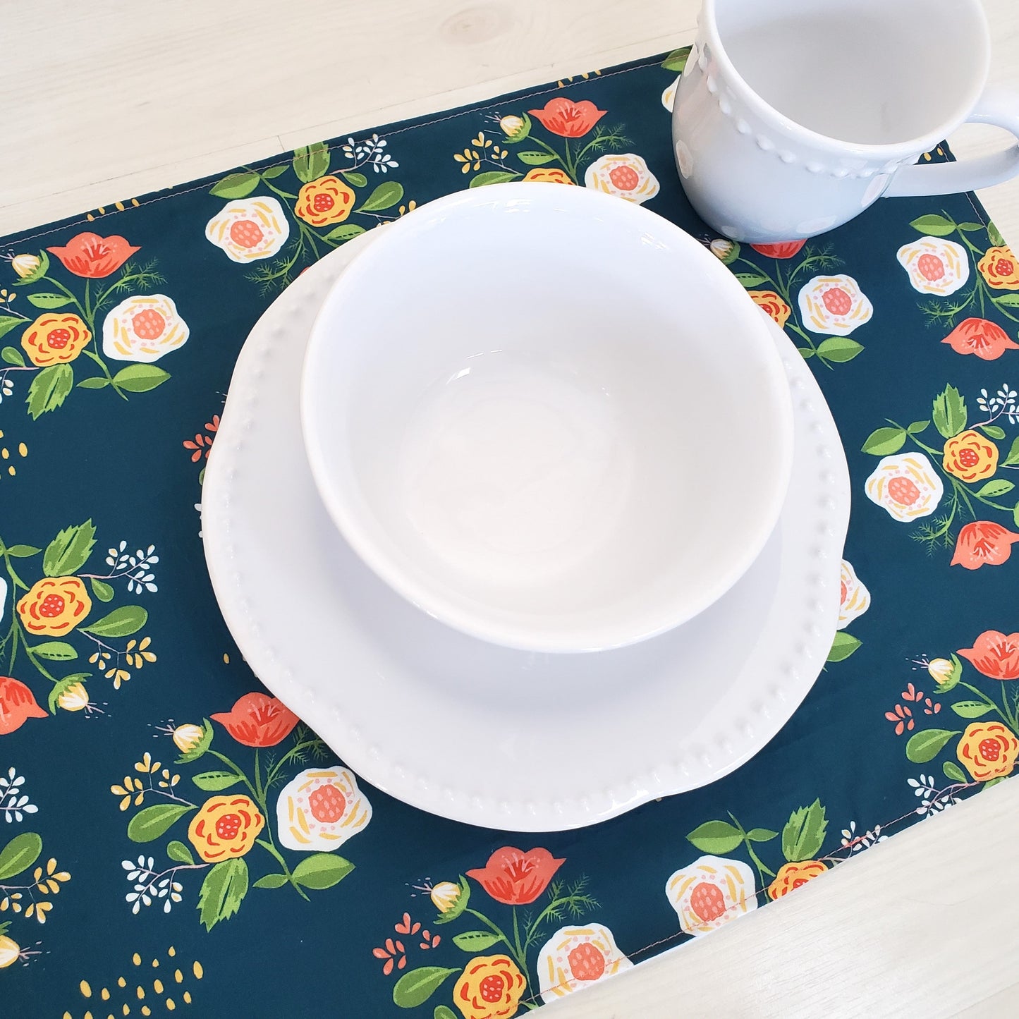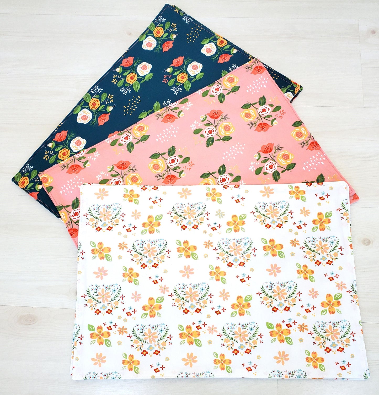 This floral print on a deep blue background will make a beautiful table. Mix and match them with two other floral patterns. These placemats have a timeless feel and rich colors including shades of pink, blue, orange and more.