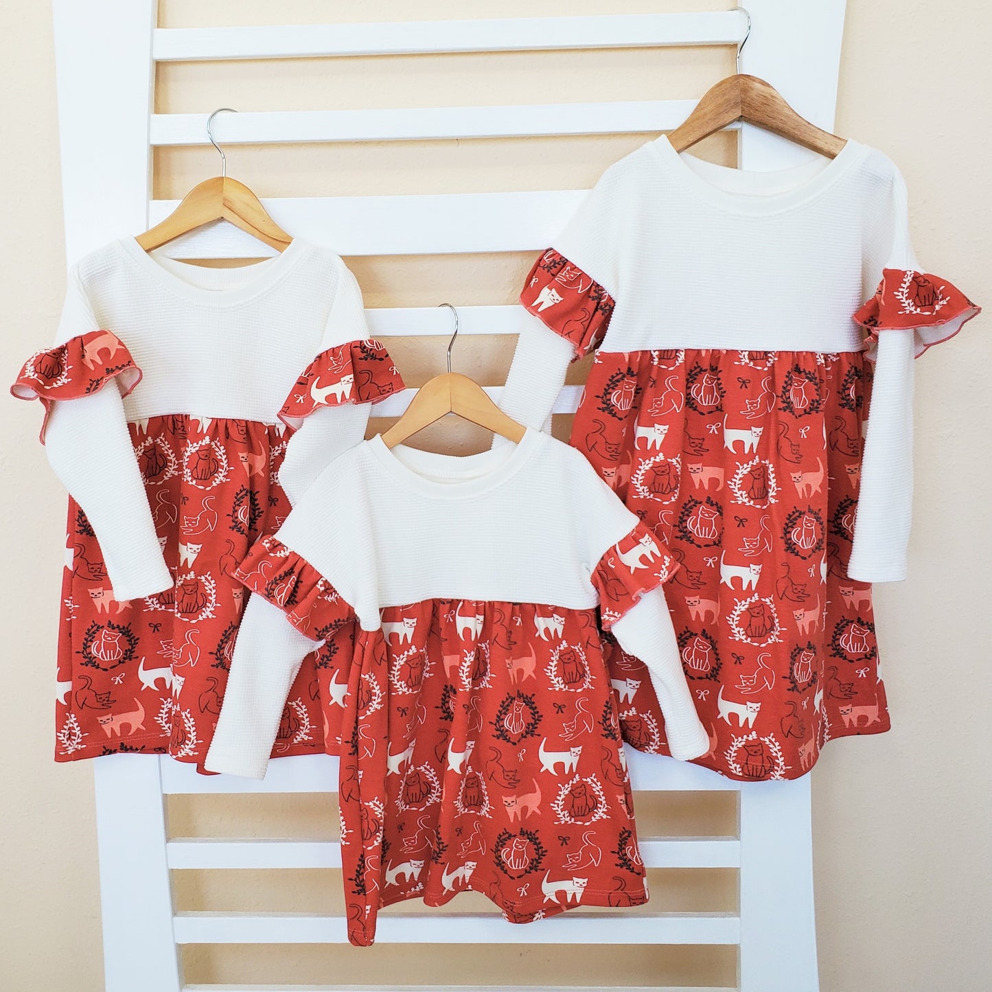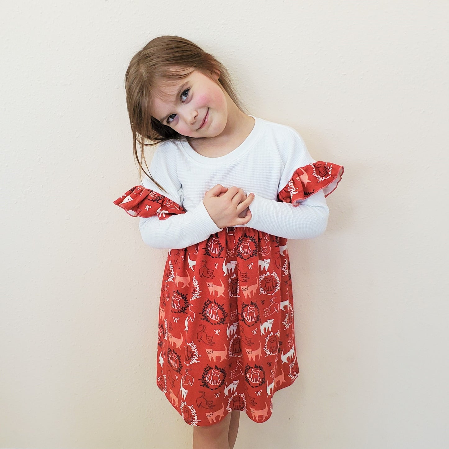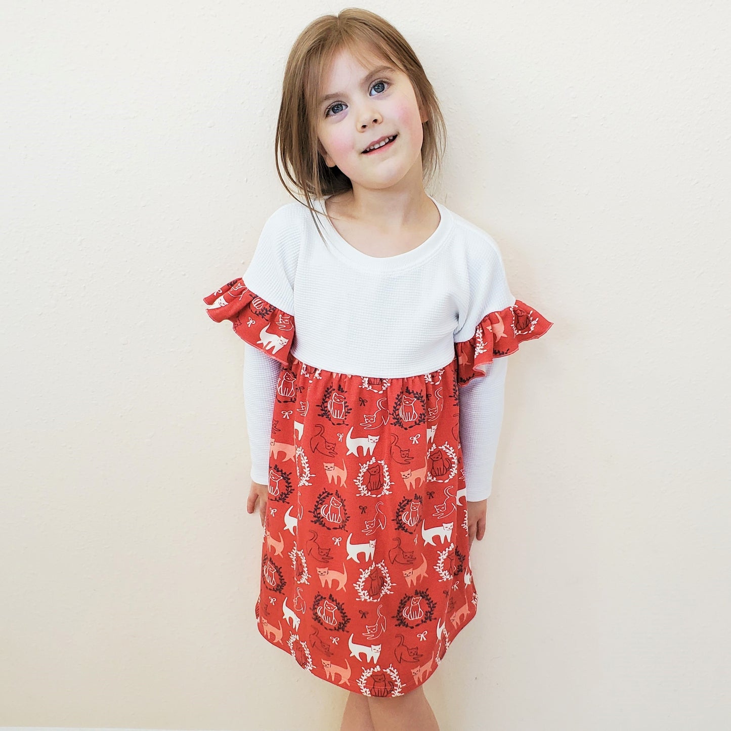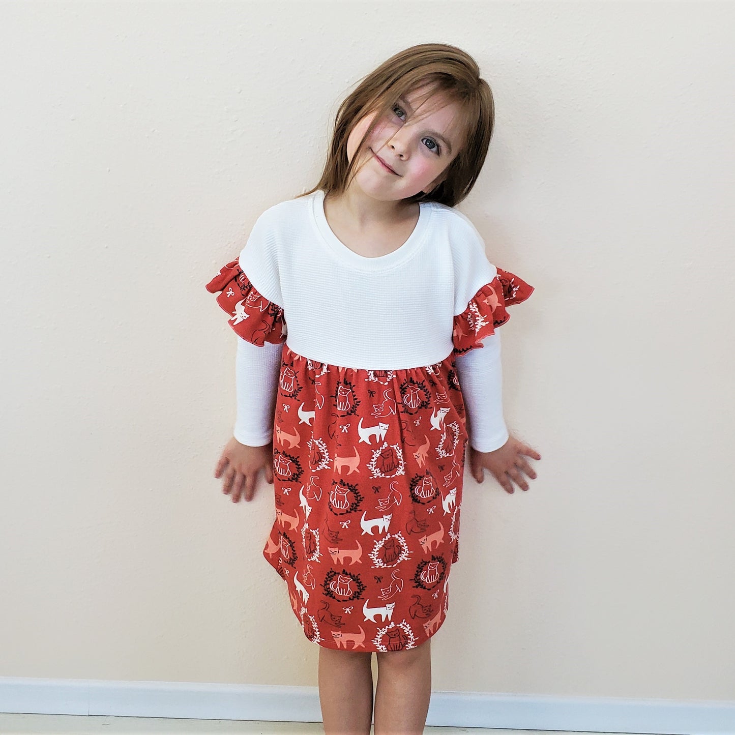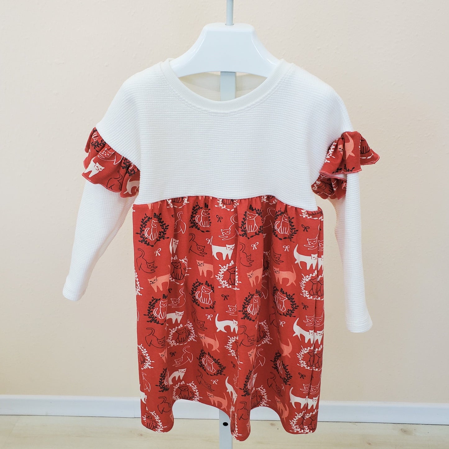 Such a beautiful little dress, that is perfect for fall and the holiday season. The bodice and sleeves are a cozy waffle knit, giving it a sweater feel. The skirt and ruffle are a soft interlock knit. The print features kitties and wreathes.
