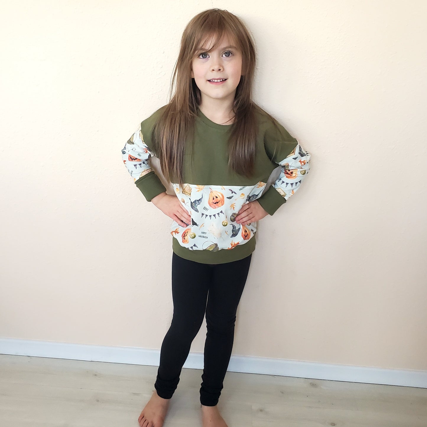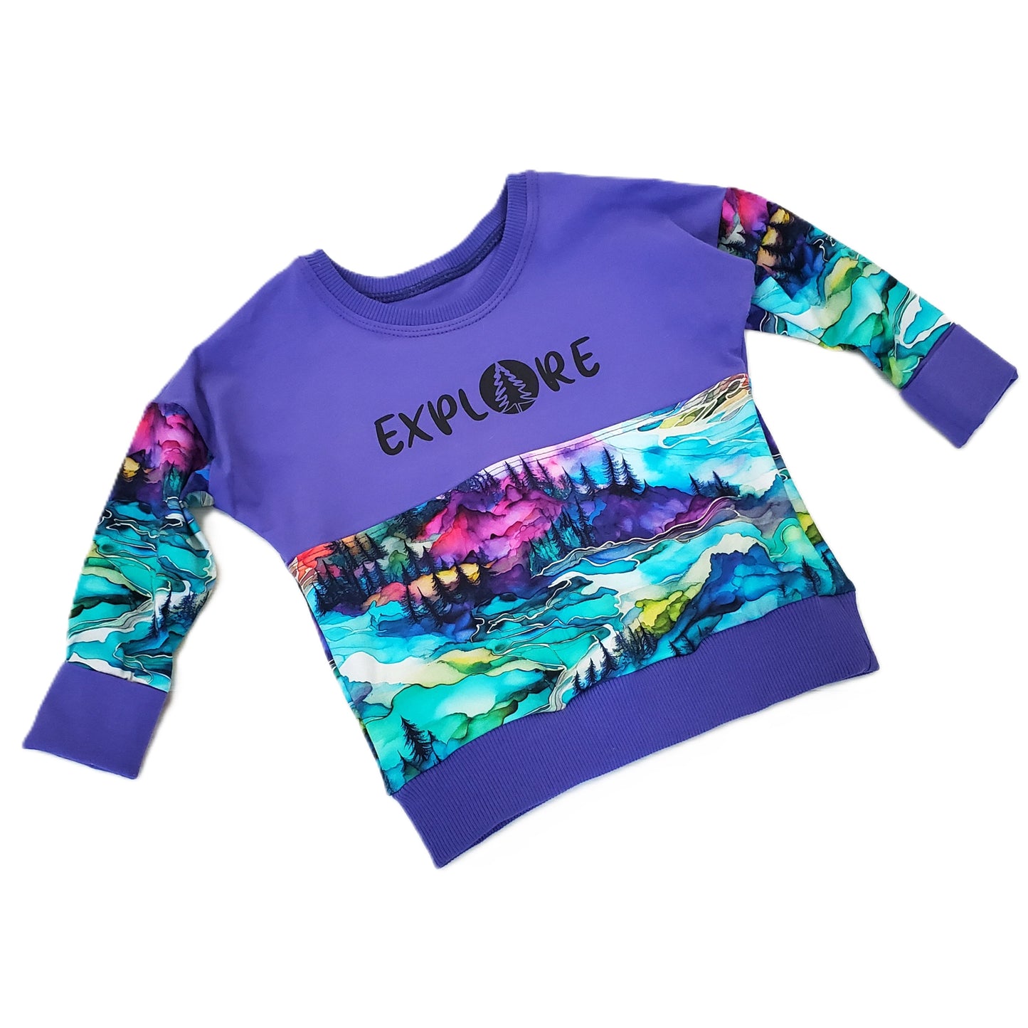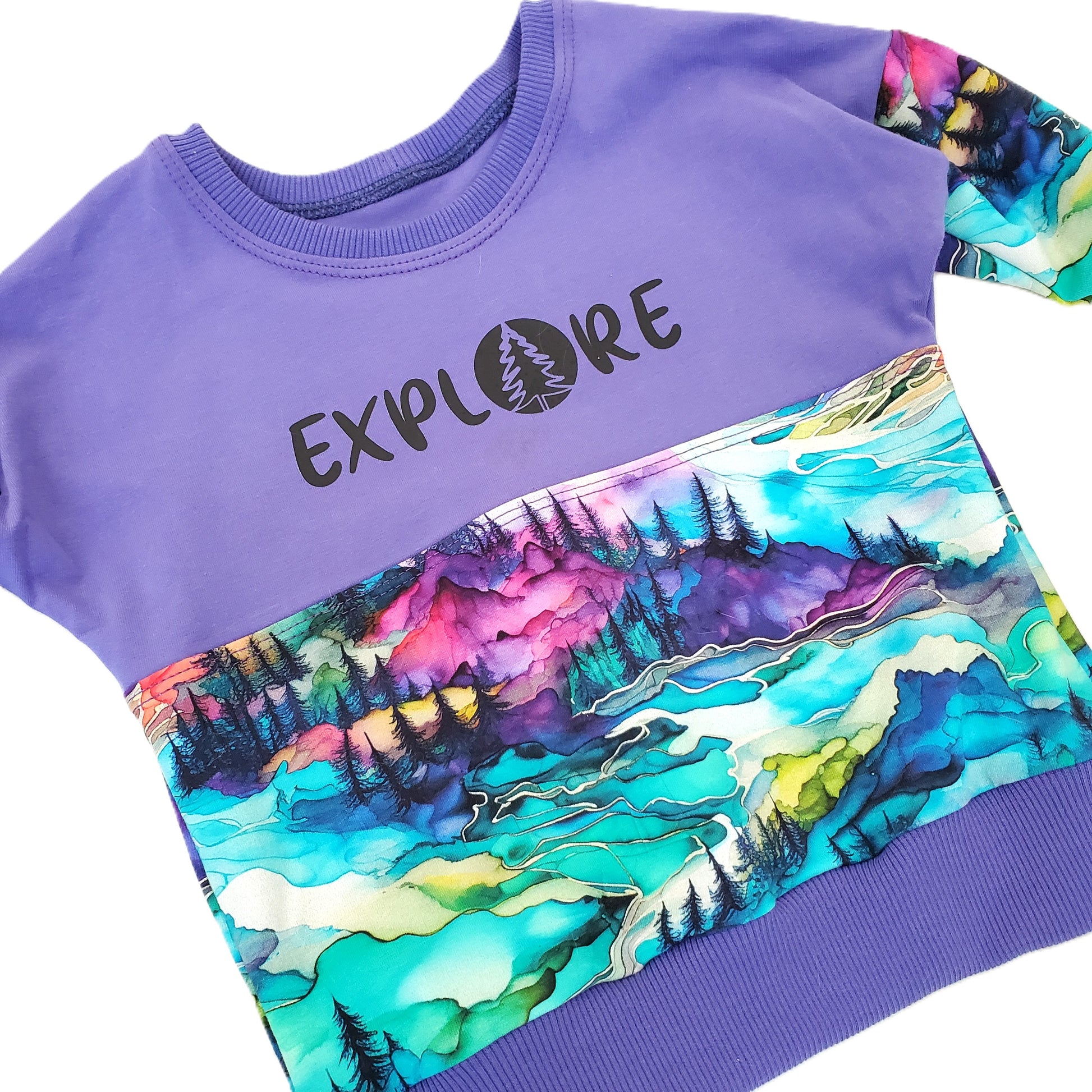 This top features a gorgeous print in purples, turquoises and more and is accented with a lovely deep purple. This is a grow with me (GWM) style pullover, so your child can wear this for several seasons. It's a perfect shirt to wear as you explore the outdoors!