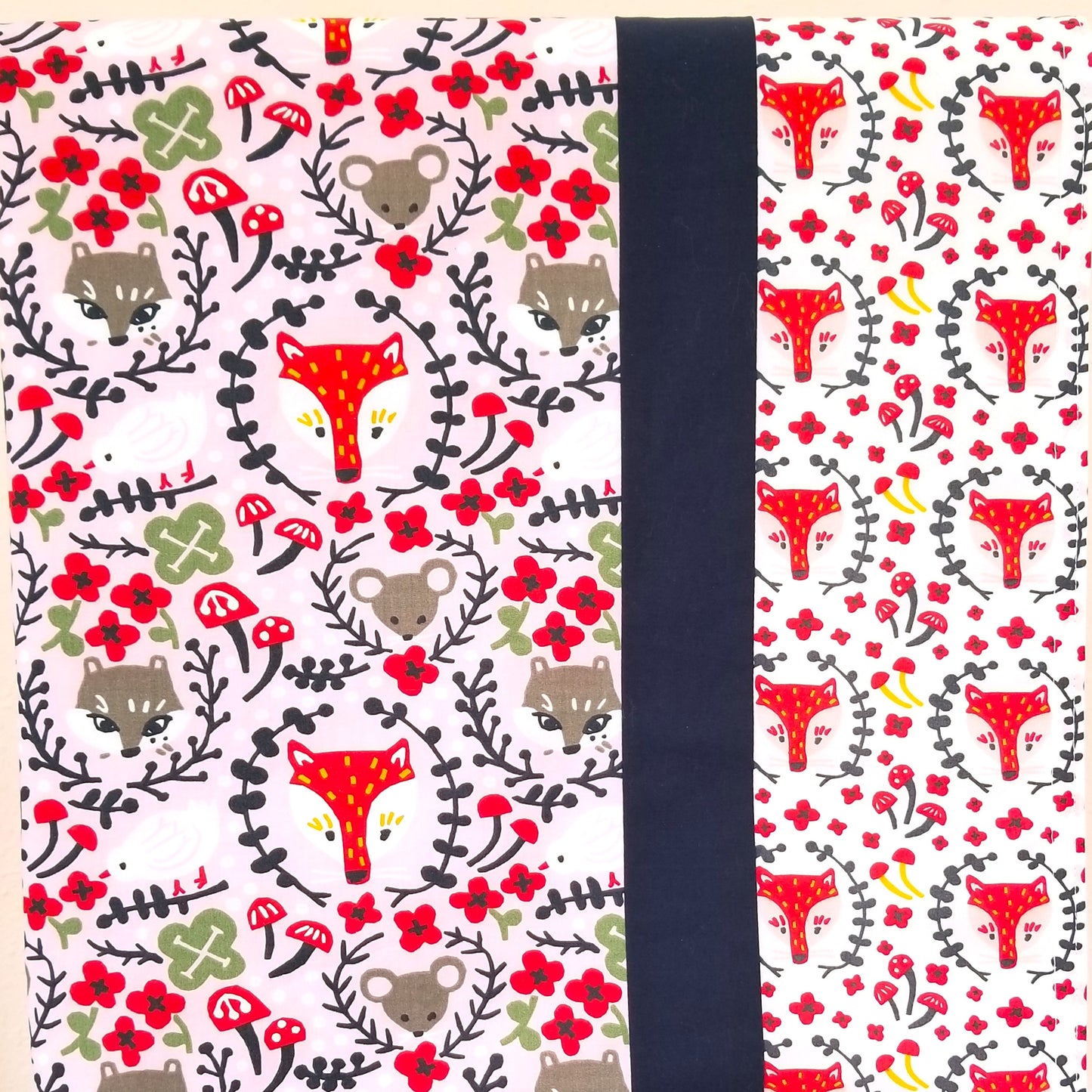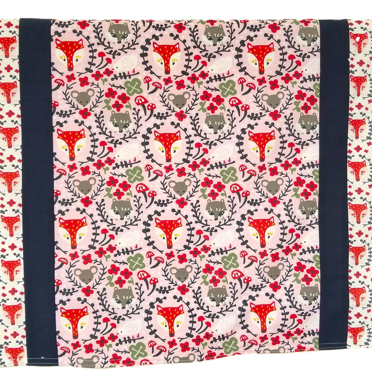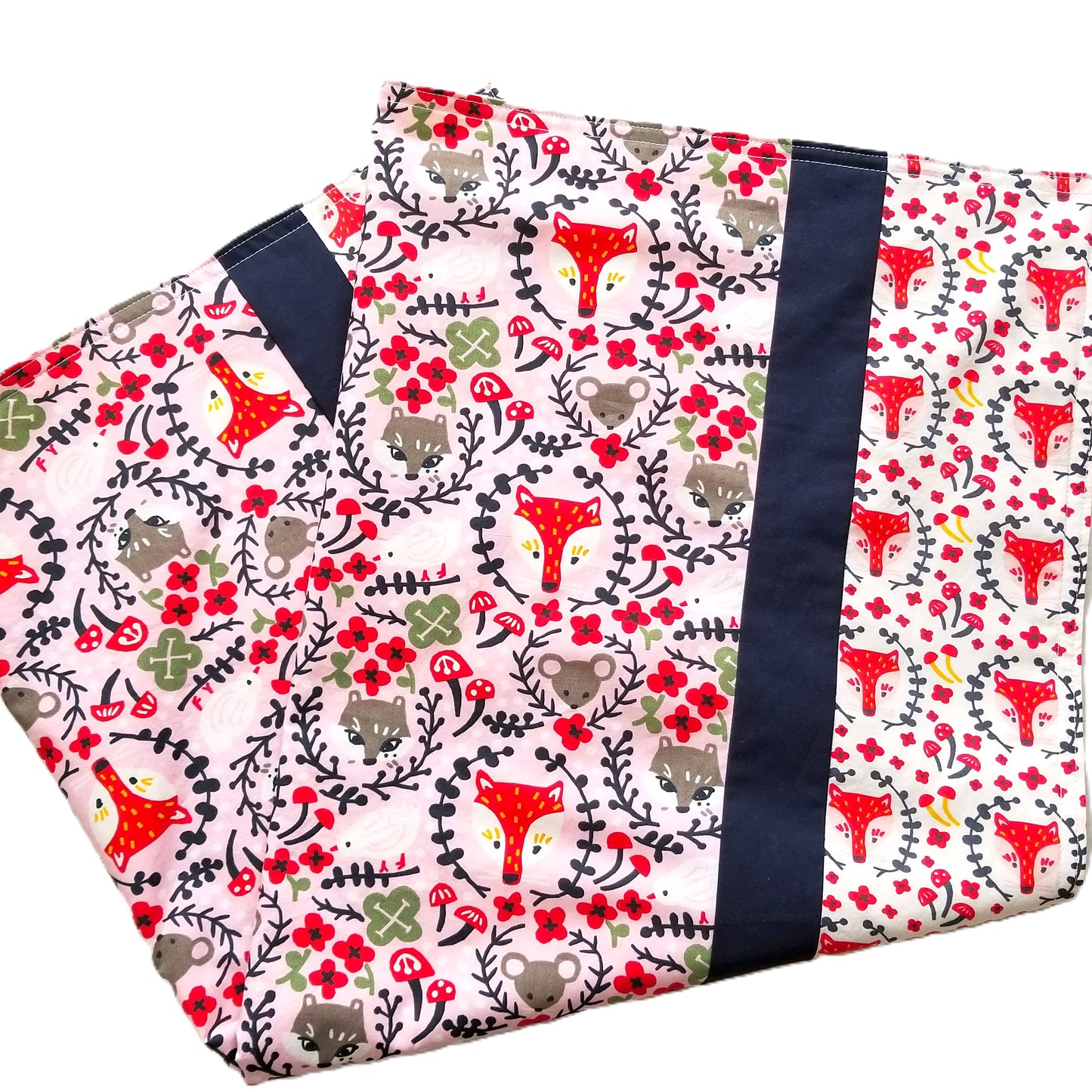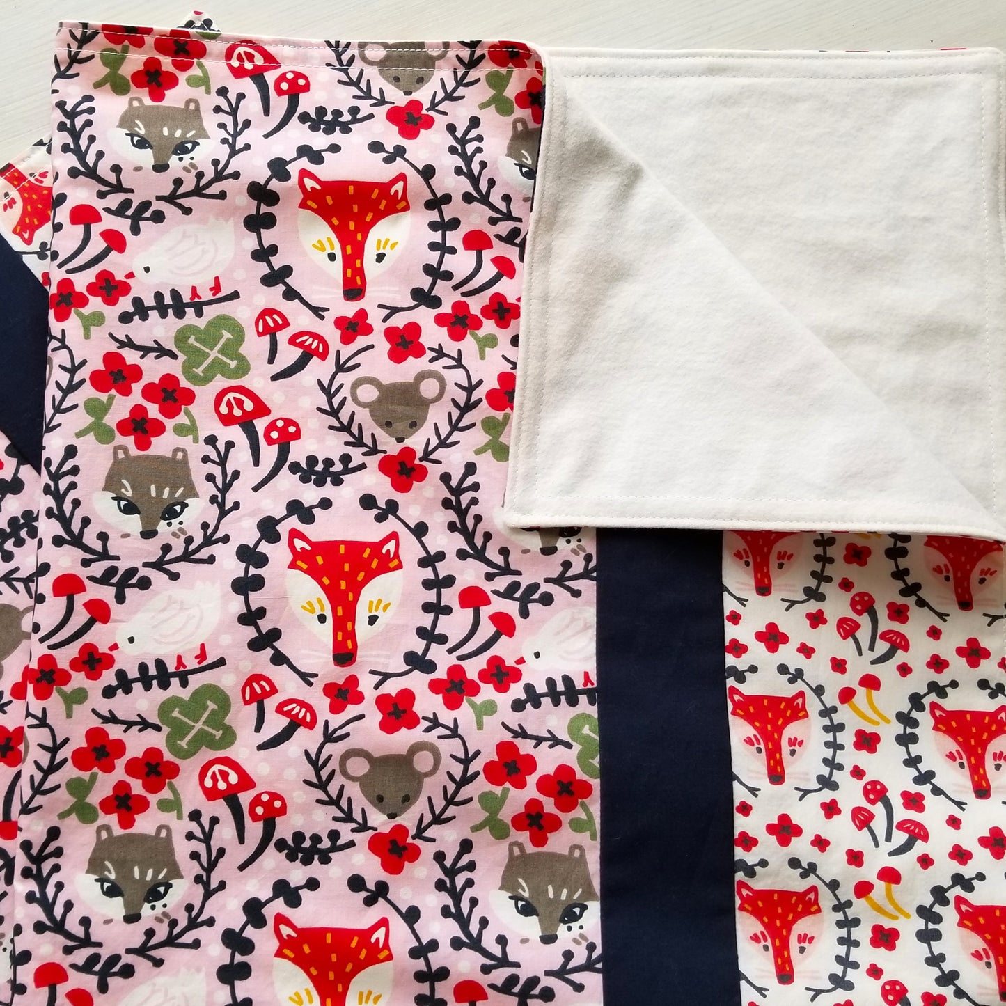 This charming fabric features sweet little fox, raccoon, and mouse faces on a blush pink background. The fabric is bordered by a deep dusk blue and another fox face fabric on cream. The back is a lovely soft natural flannel.