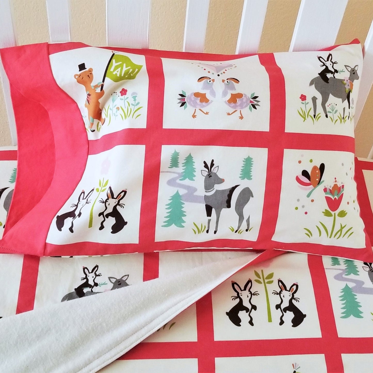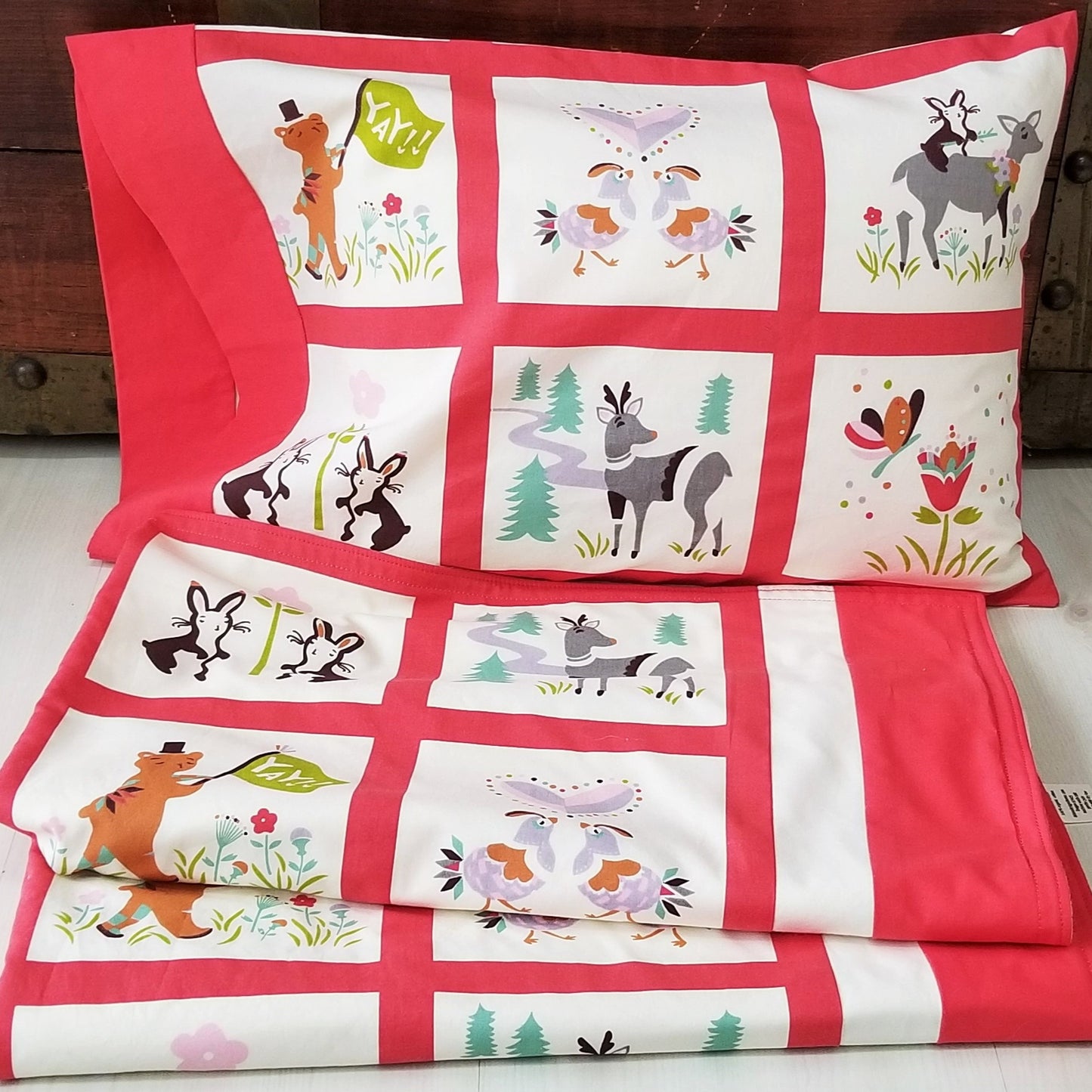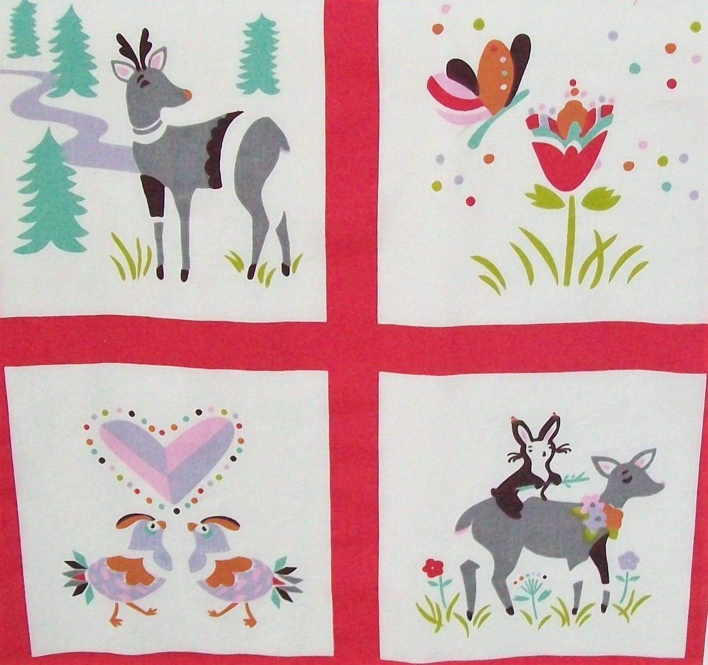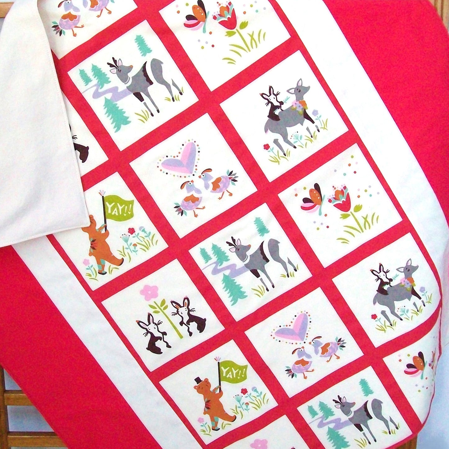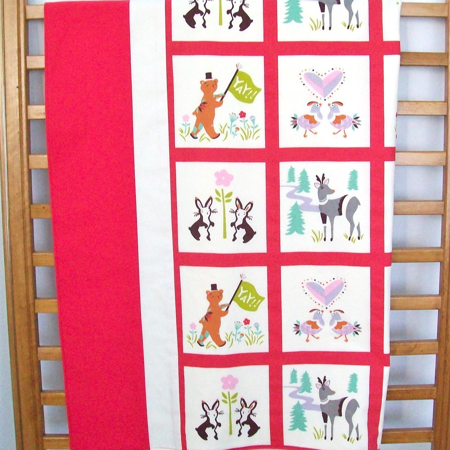 This delightful blanket features a block print with bears, bunnies, deer, chickens and more, bordered by coordinating red and off-white fabric. So cheerful in shades of red, teal, green, brown, orange, purple and pink. The back is a super soft flannel making it nice and cuddly for your little one.