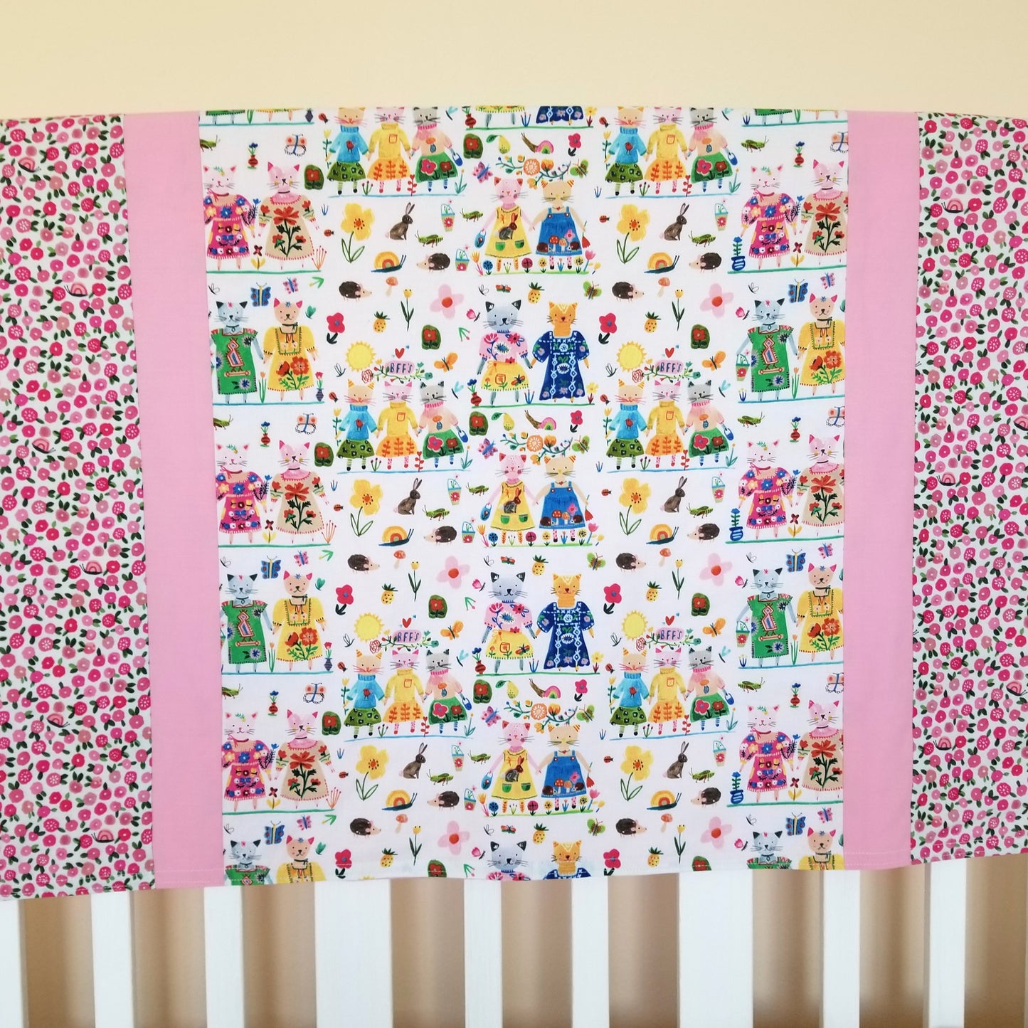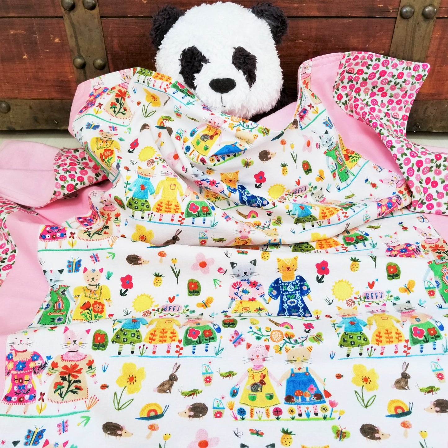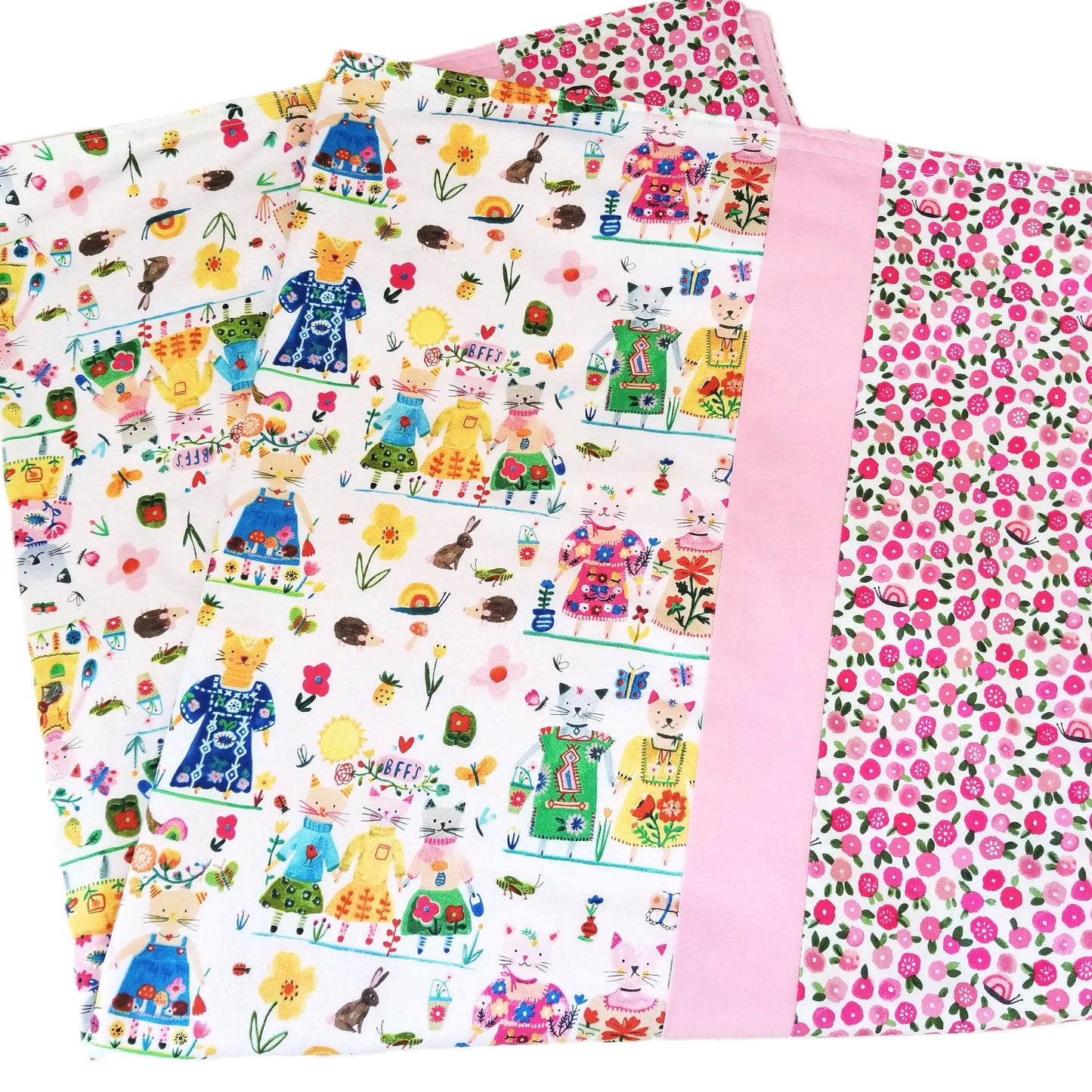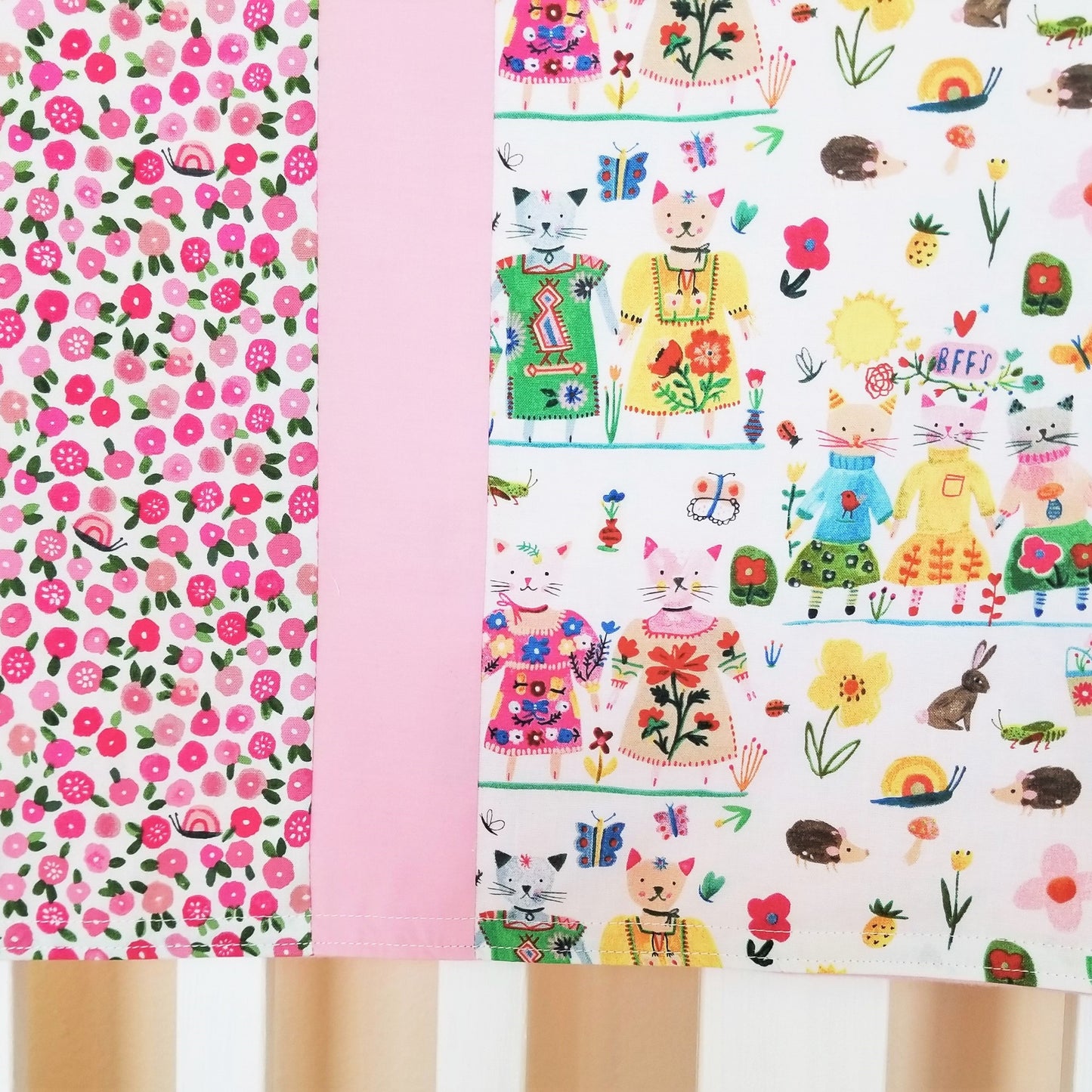 This fabric is just so adorable!!!! The main print features colorful kittens holding hands. It is bordered by a pink stripe and a pink floral print, with a soft pink flannel on the back. Check out the close-up shot with the little hearts and "BFFS".