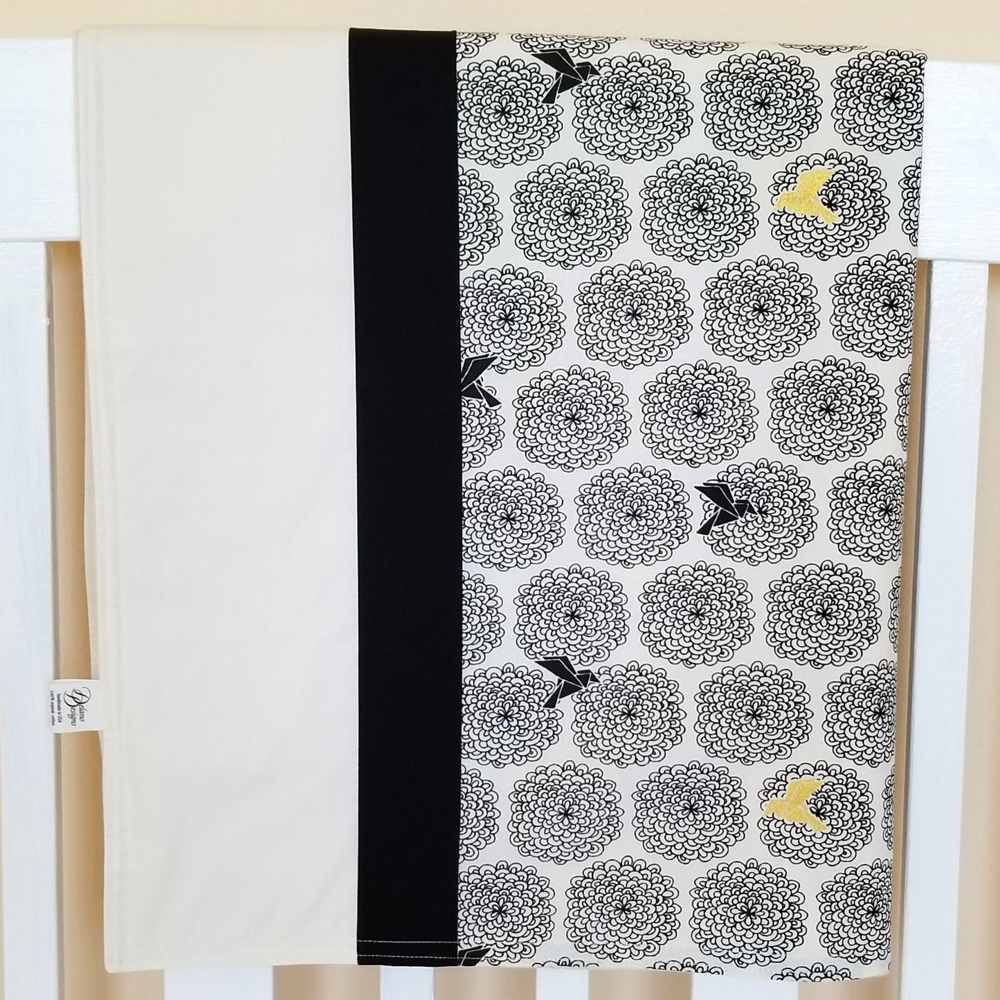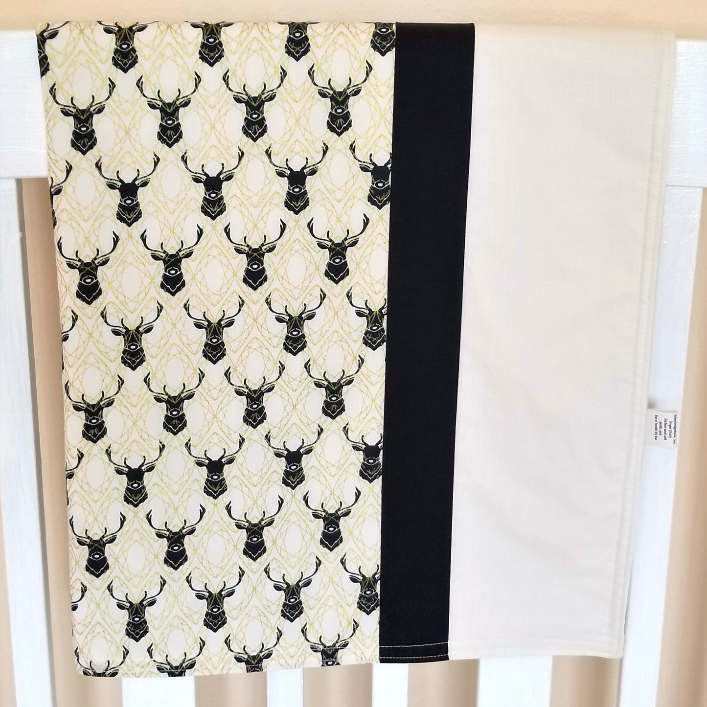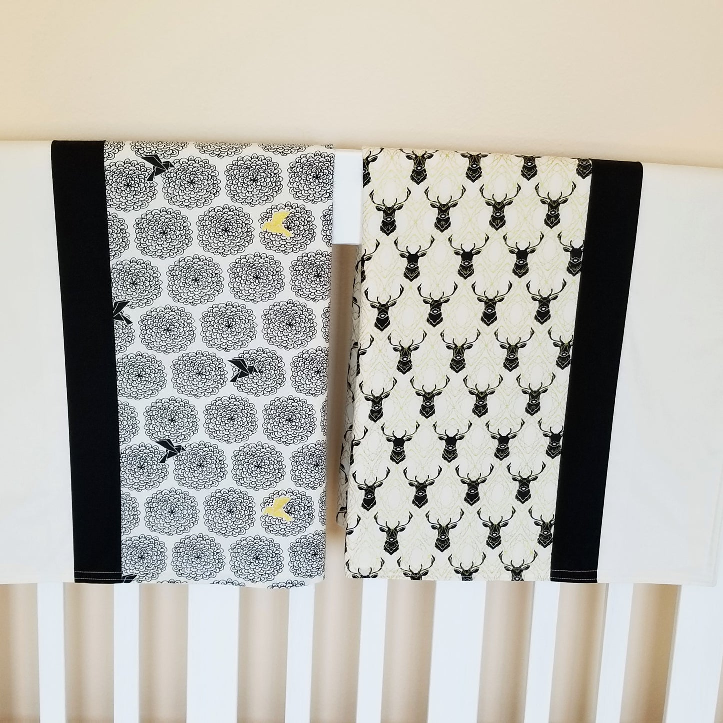 Such a beautiful organic cotton baby blankets in black, creamy white, and metallic gold accents. They are backed with a soft and cozy organic natural flannel. You can choose an elk print with diamonds in gold, or a floral print with birds in black and gold.