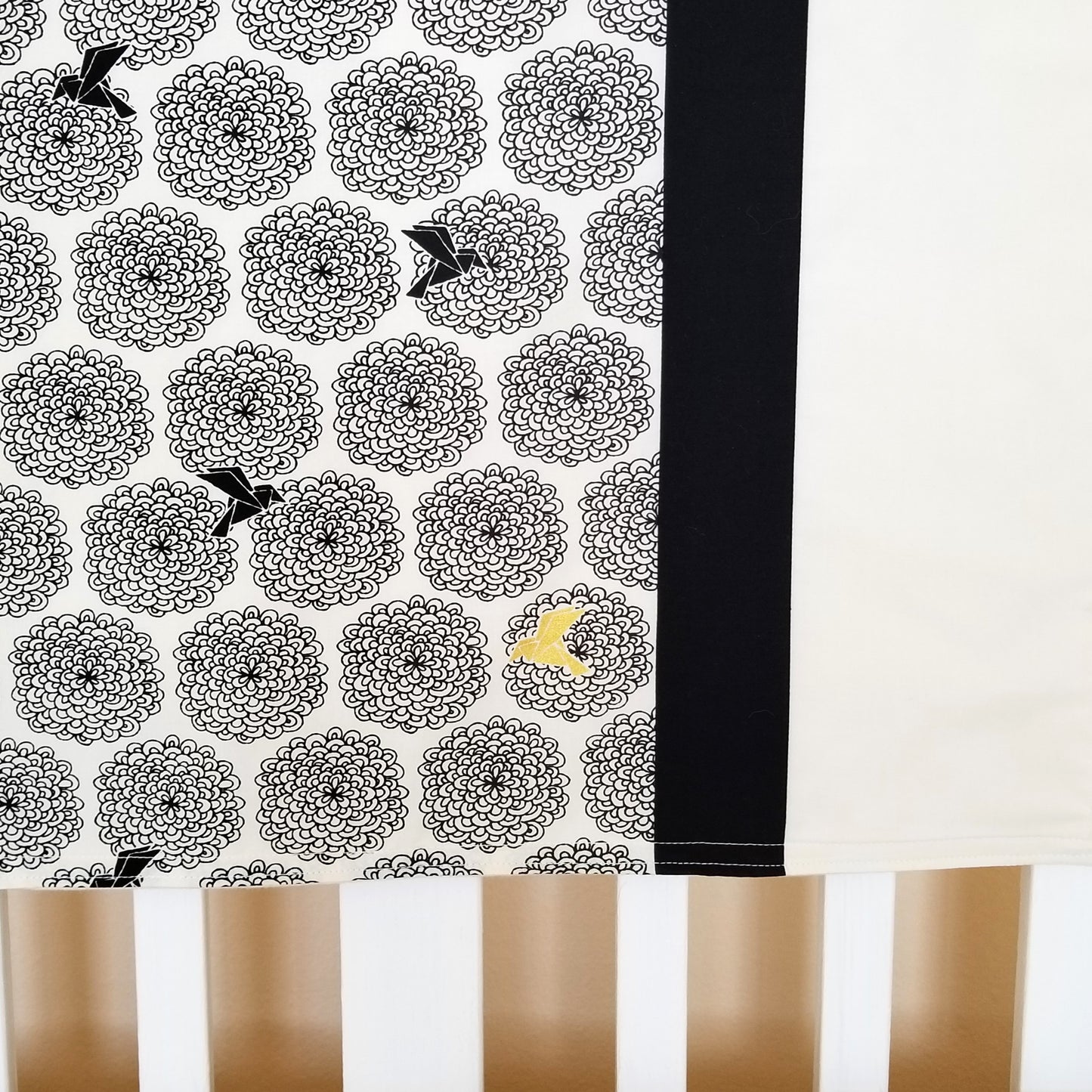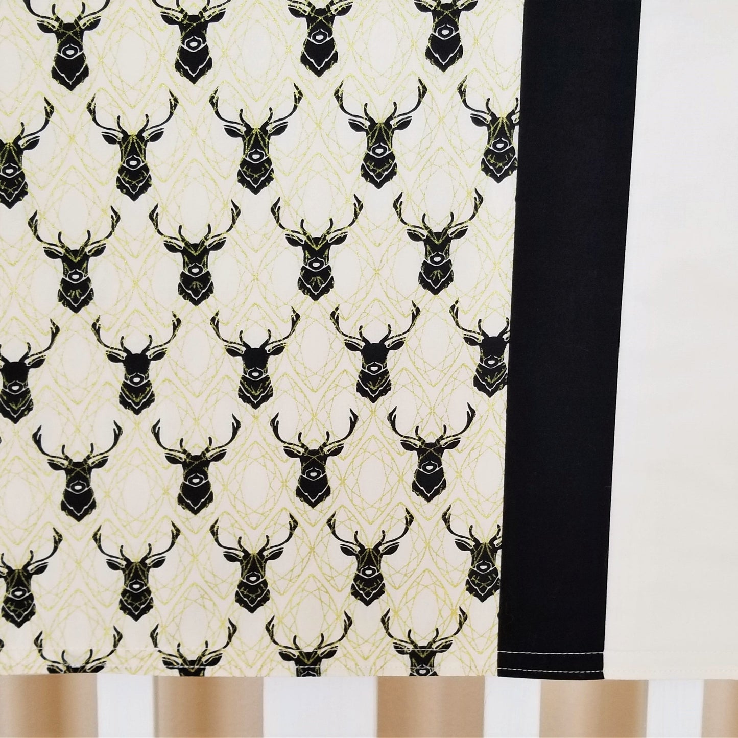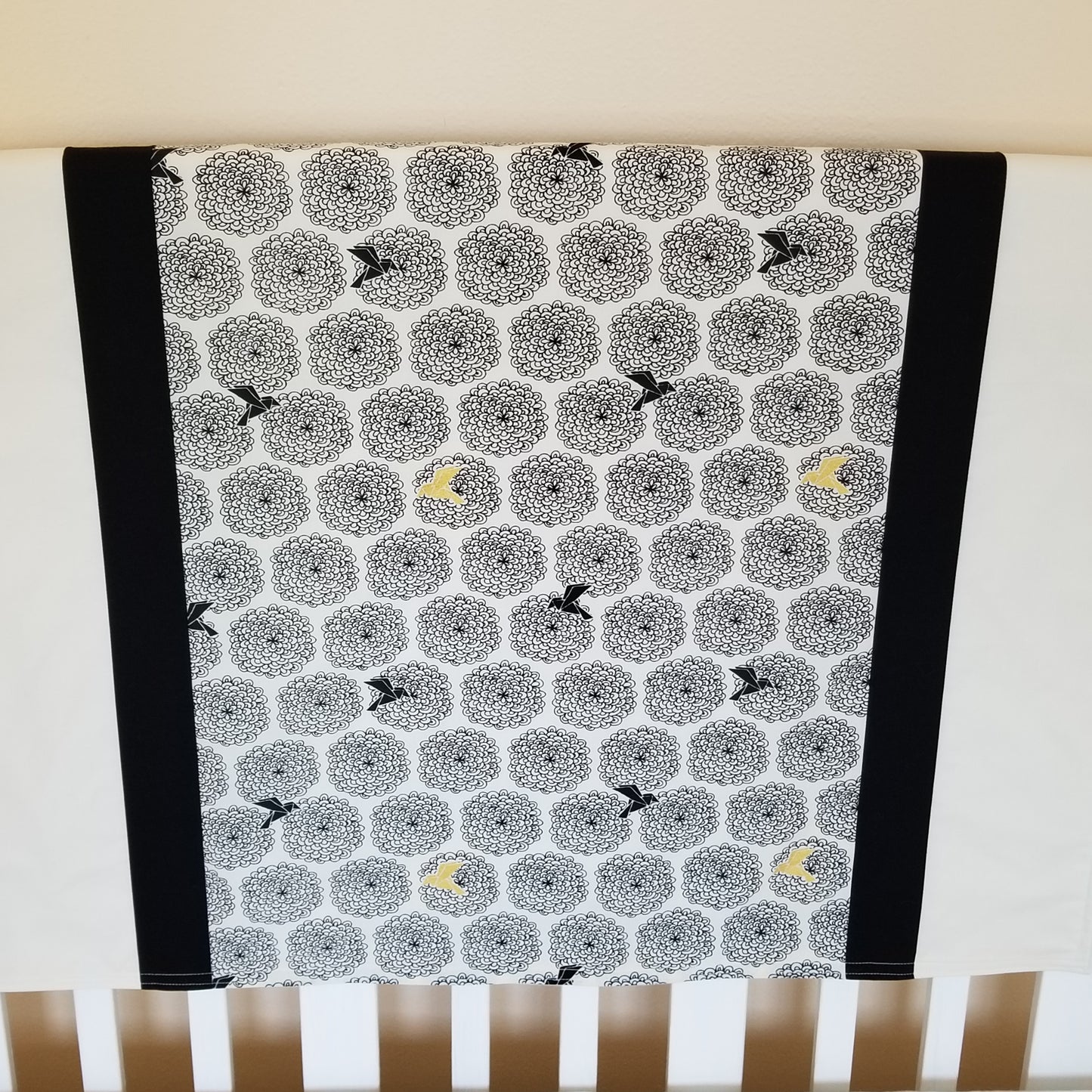Such a beautiful organic cotton baby blankets in black, creamy white, and metallic gold accents. They are backed with a soft and cozy organic natural flannel. You can choose an elk print with diamonds in gold, or a floral print with birds in black and gold.