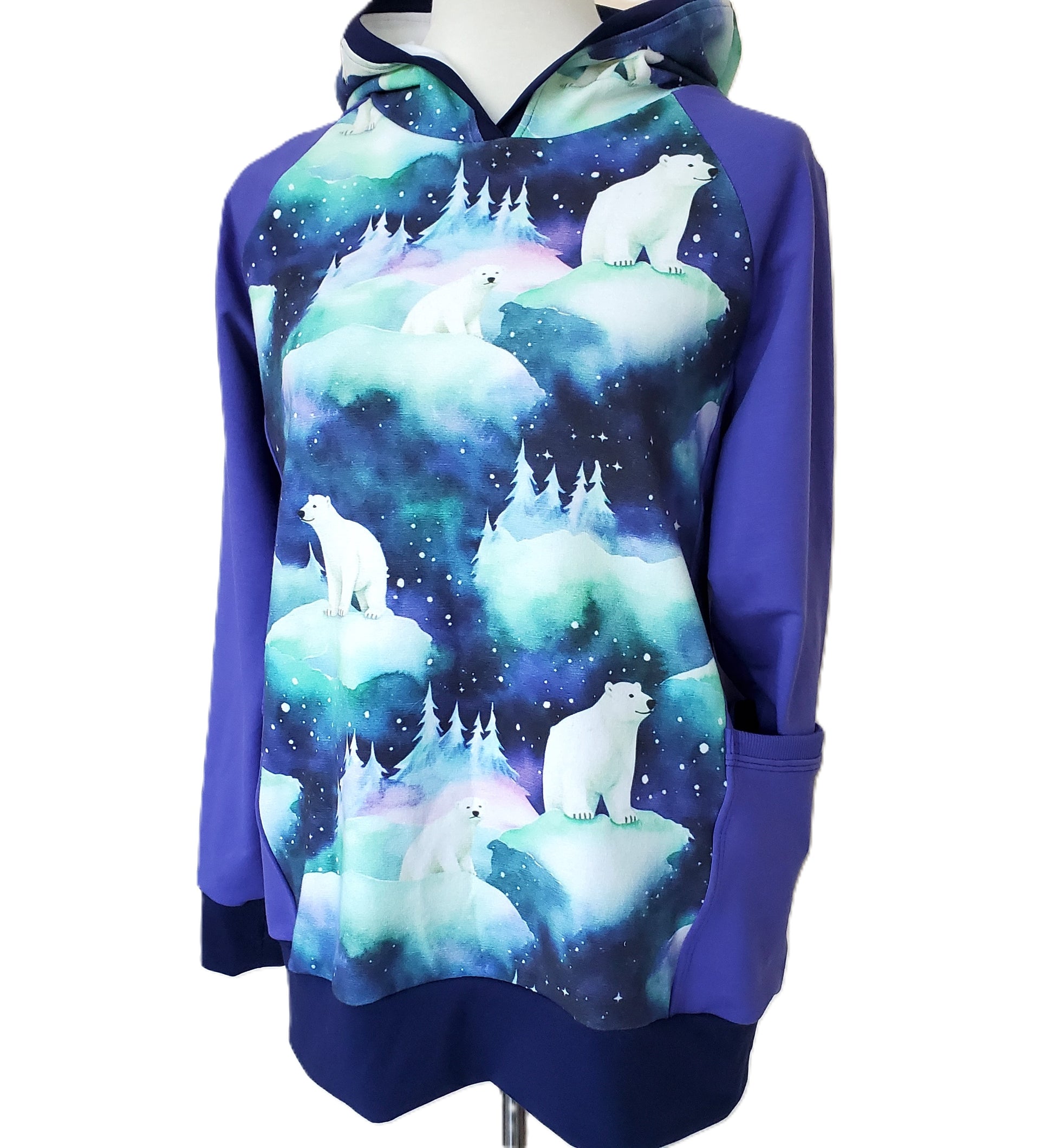 The colors in this hoodie are just gorgeous. It features a beautiful polar bear print and is accented with purple and navy blue. It has side pockets and a hood to keep you nice and cozy.