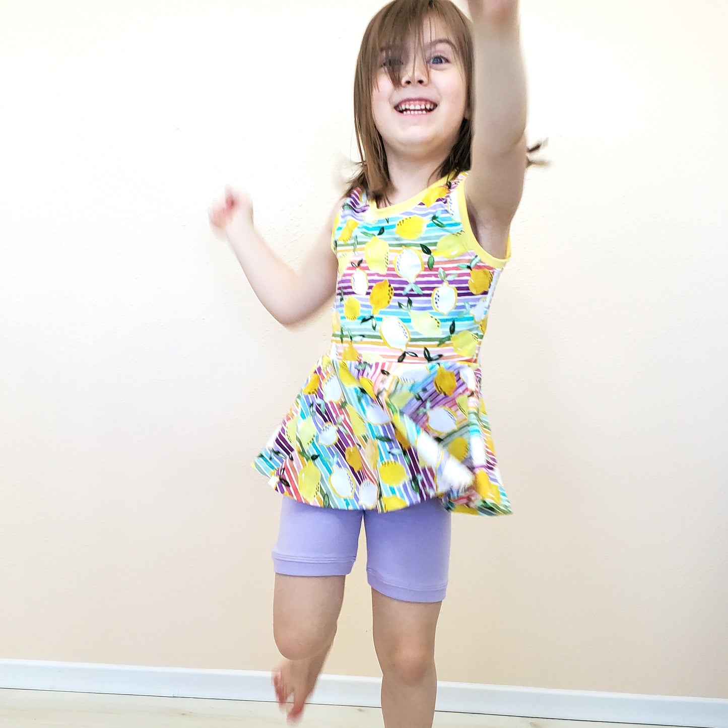 Add a pair of leggings or shorts to your Goodnight Moon tops and dresses! We have a beautiful teal, a sunny yellow and a basic black that coordinate well with these fabrics.