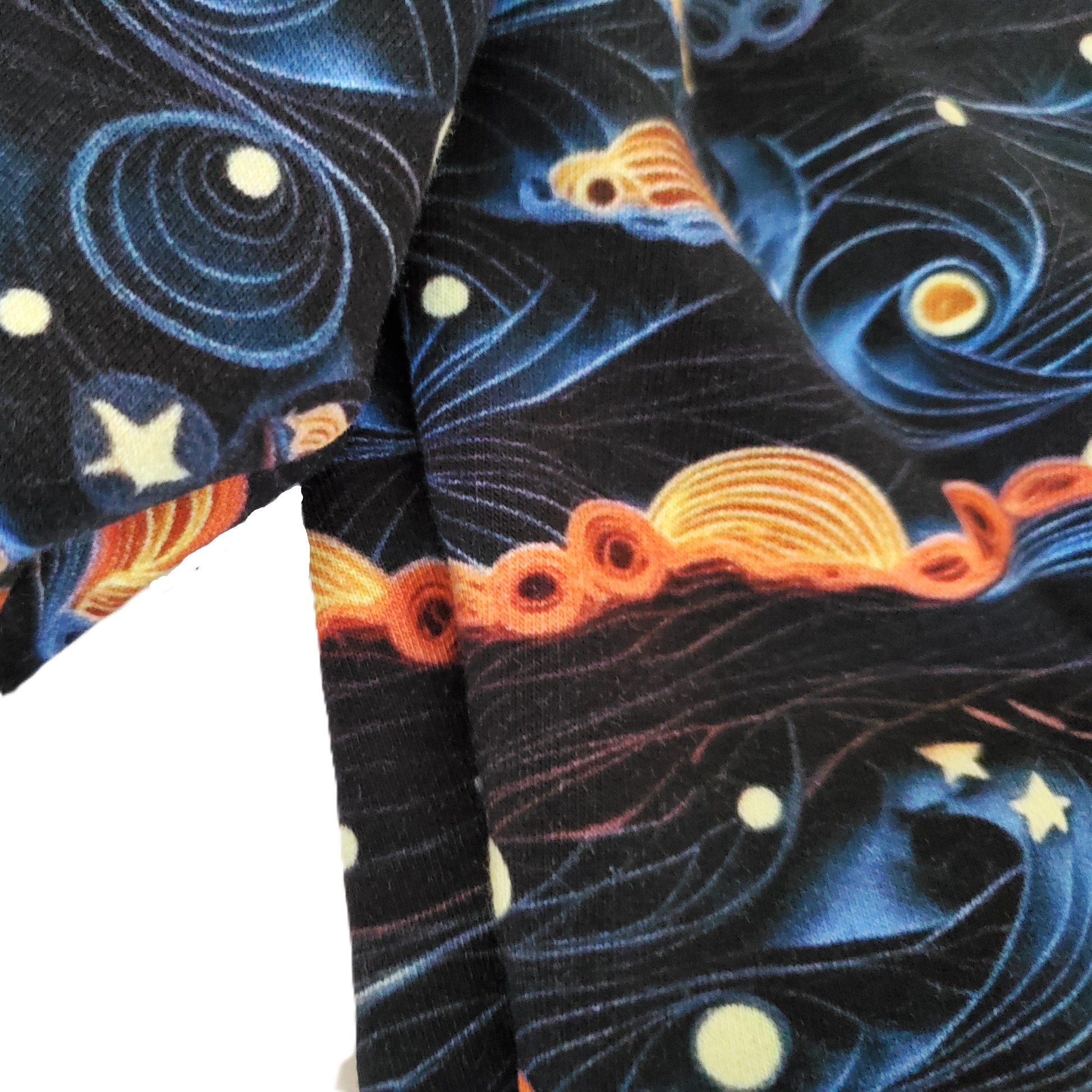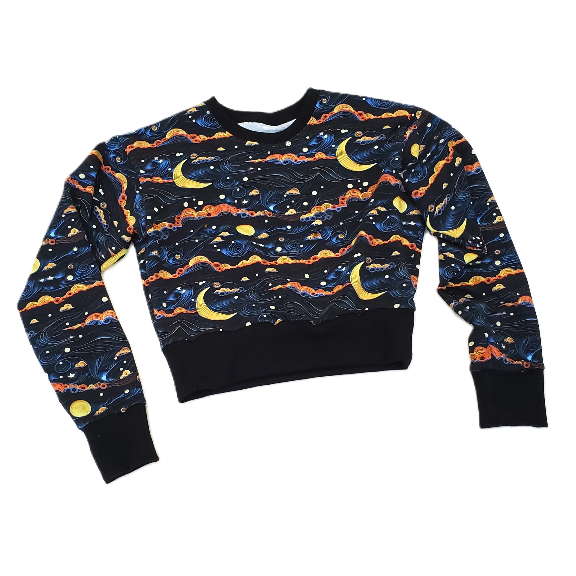 This french terry sweater features golden moons and swirly blue and orange skies. It is a Women's size Small and also works well for many tweens and teens. This sweater has such a great fall, moody vibe.