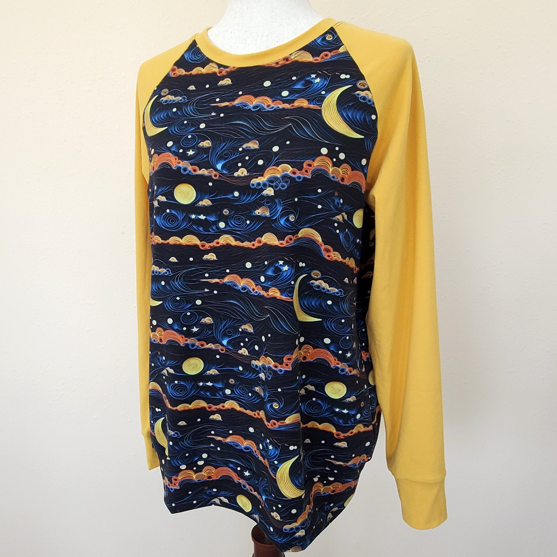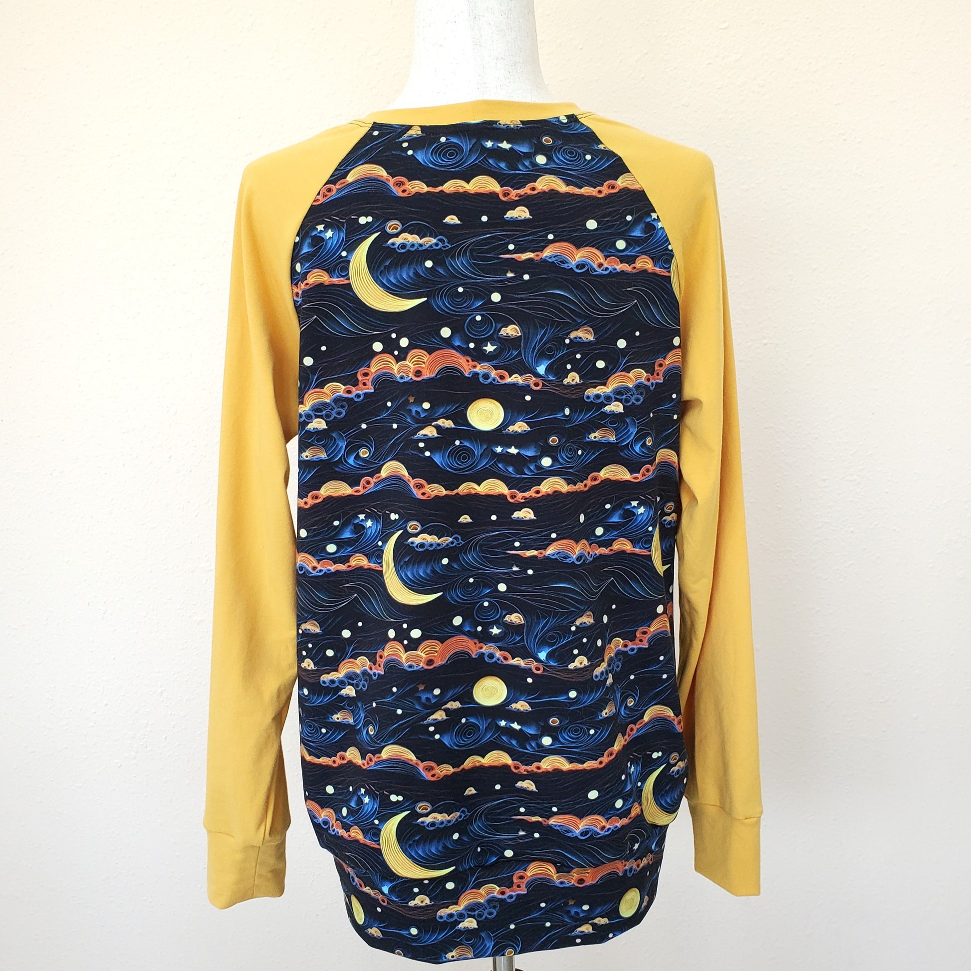 A beautiful swirly sky, with colorful clouds and moons grace this pullover for women. It has coordinating golden sleeves and a neckband. The print fabric is a cozy french terry, the gold is jersey, all fabrics 95% organic cotton/5% lycra.
