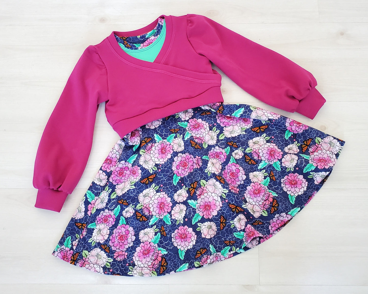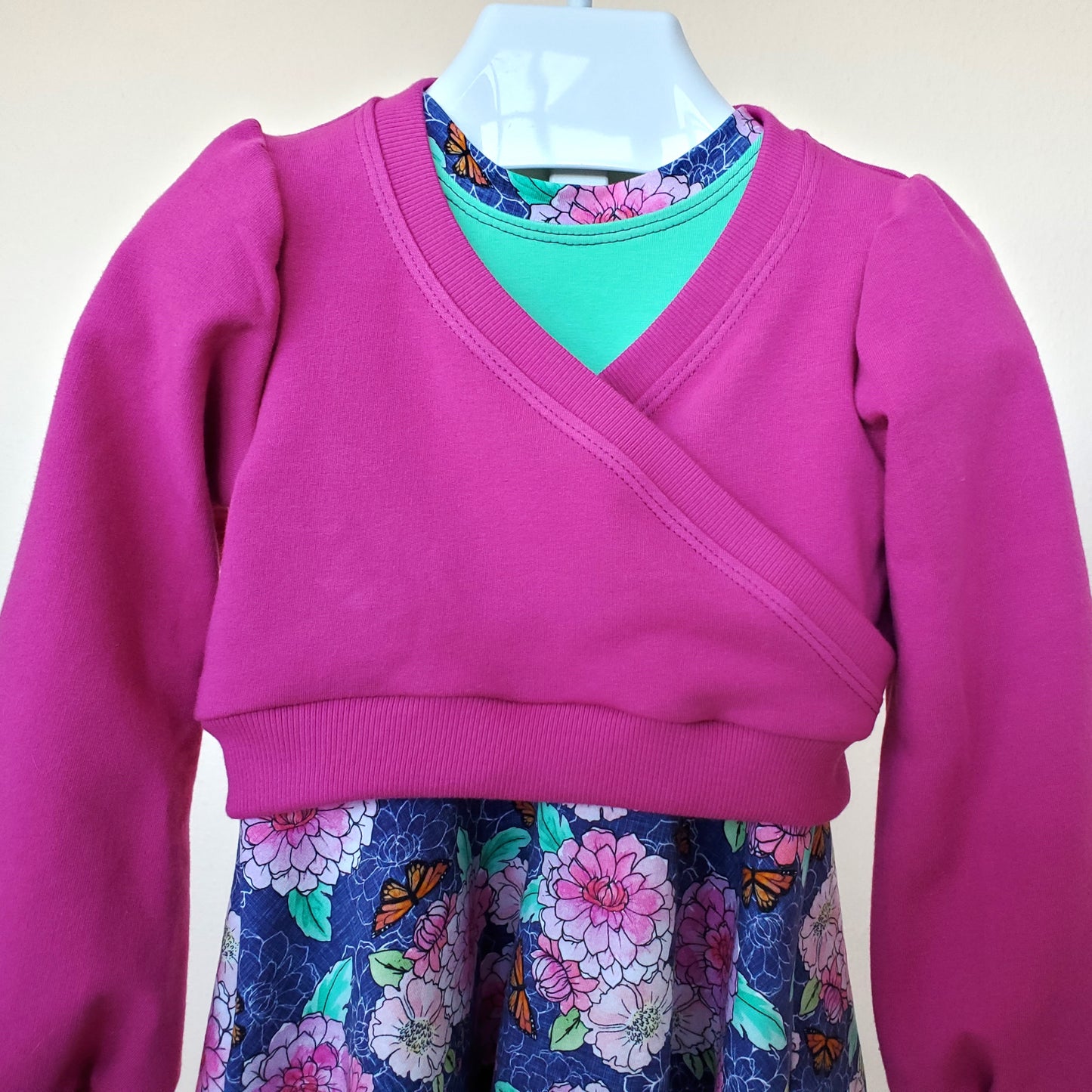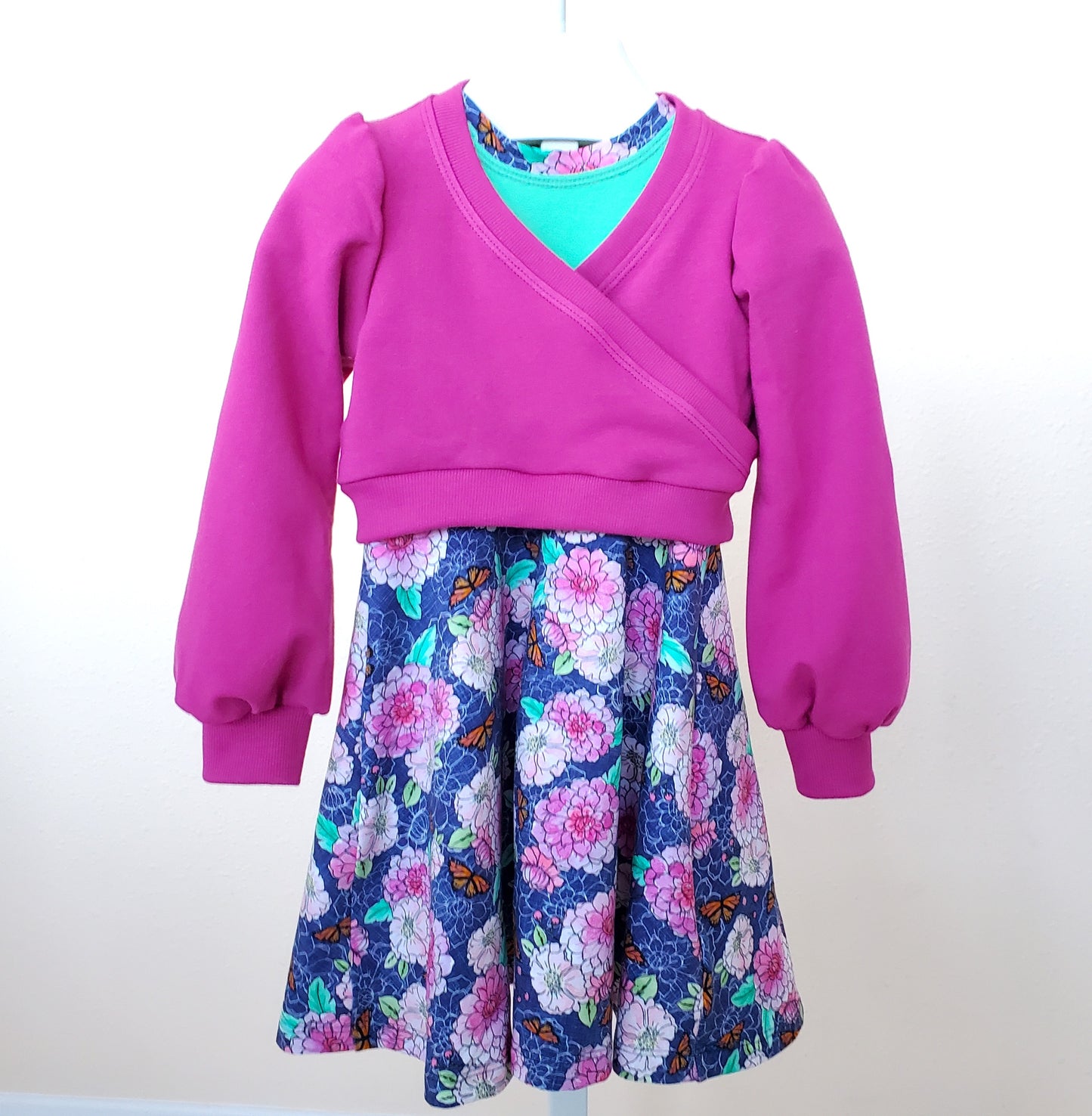 This dress features a beautiful floral print with little butterflies. The green bodice sets off the print beautifully. And for cooler days and night you can add this beautiful crossover sweater with full sleeves so it goes easily over other tops and dresses. The dress is a half-circle and is perfect for twirling!