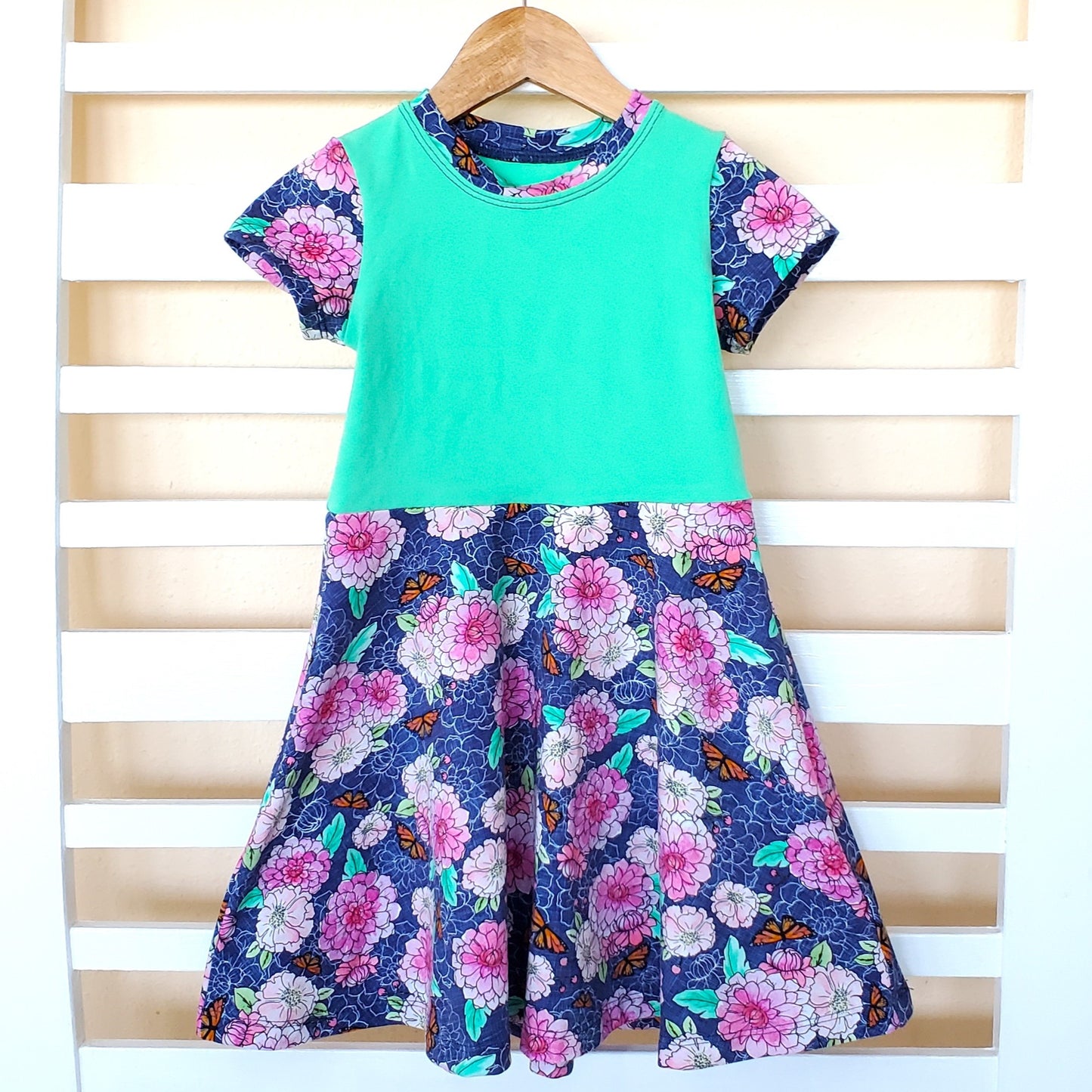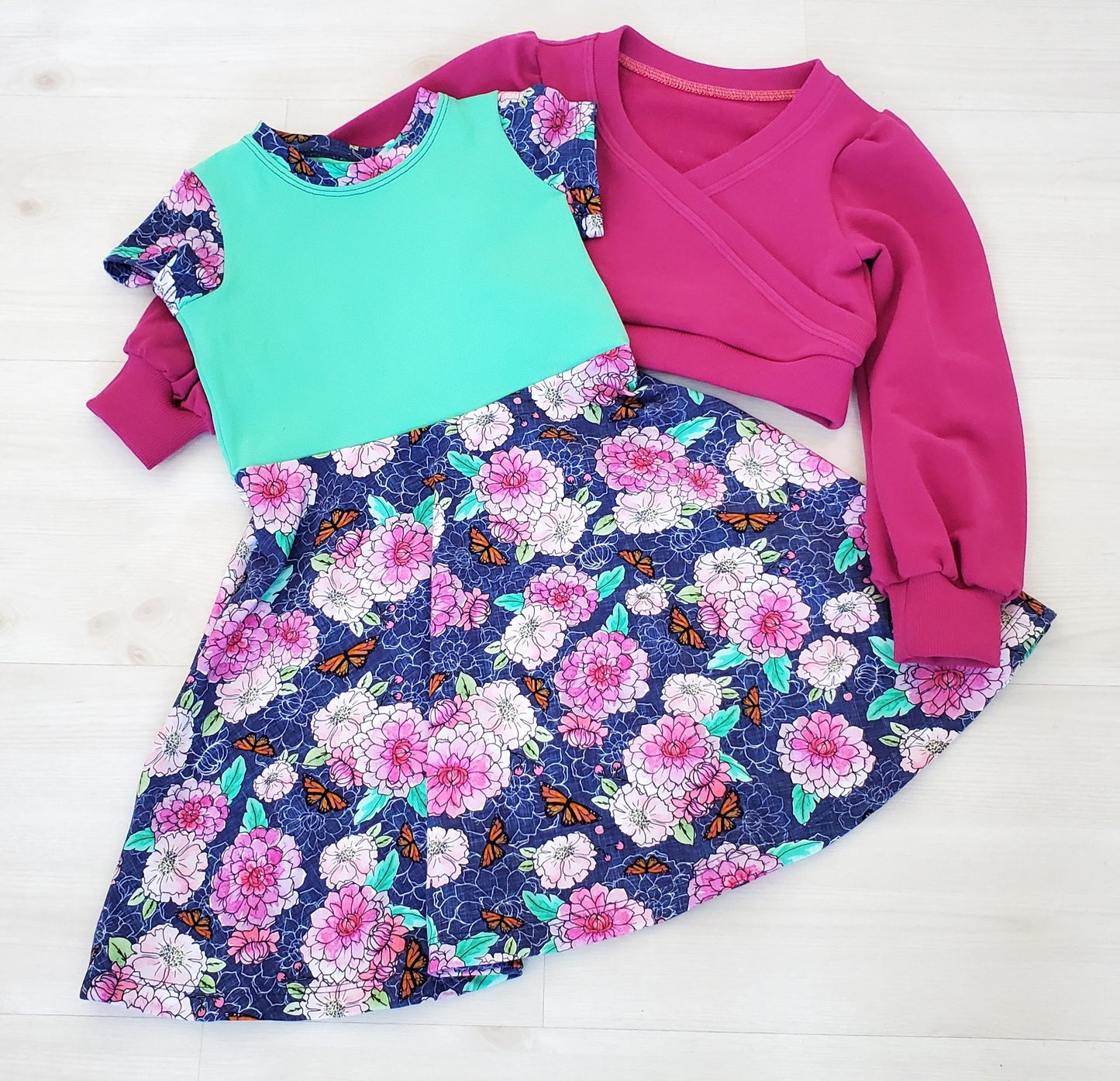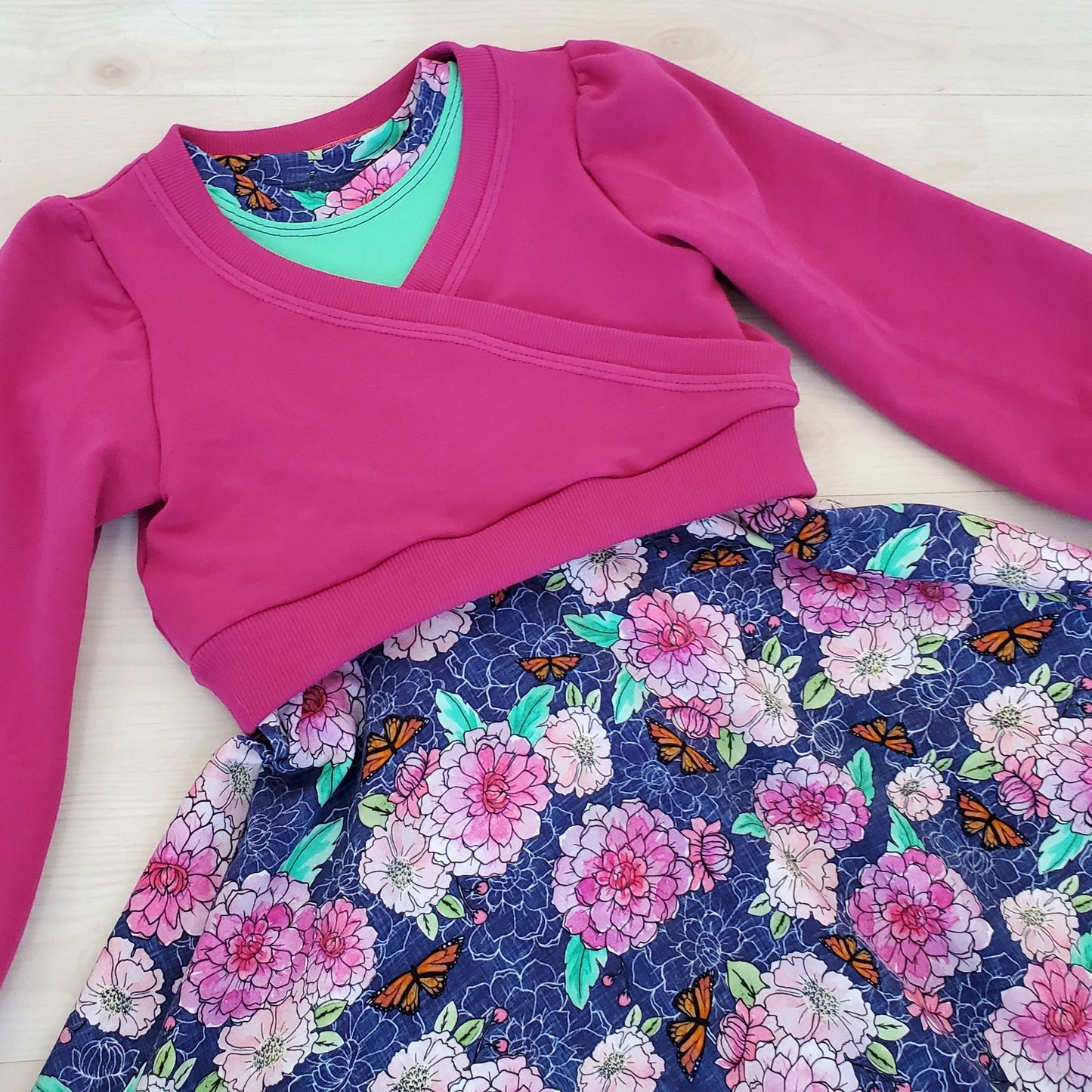 This dress features a beautiful floral print with little butterflies. The green bodice sets off the print beautifully. And for cooler days and night you can add this beautiful crossover sweater with full sleeves so it goes easily over other tops and dresses. The dress is a half-circle and is perfect for twirling!