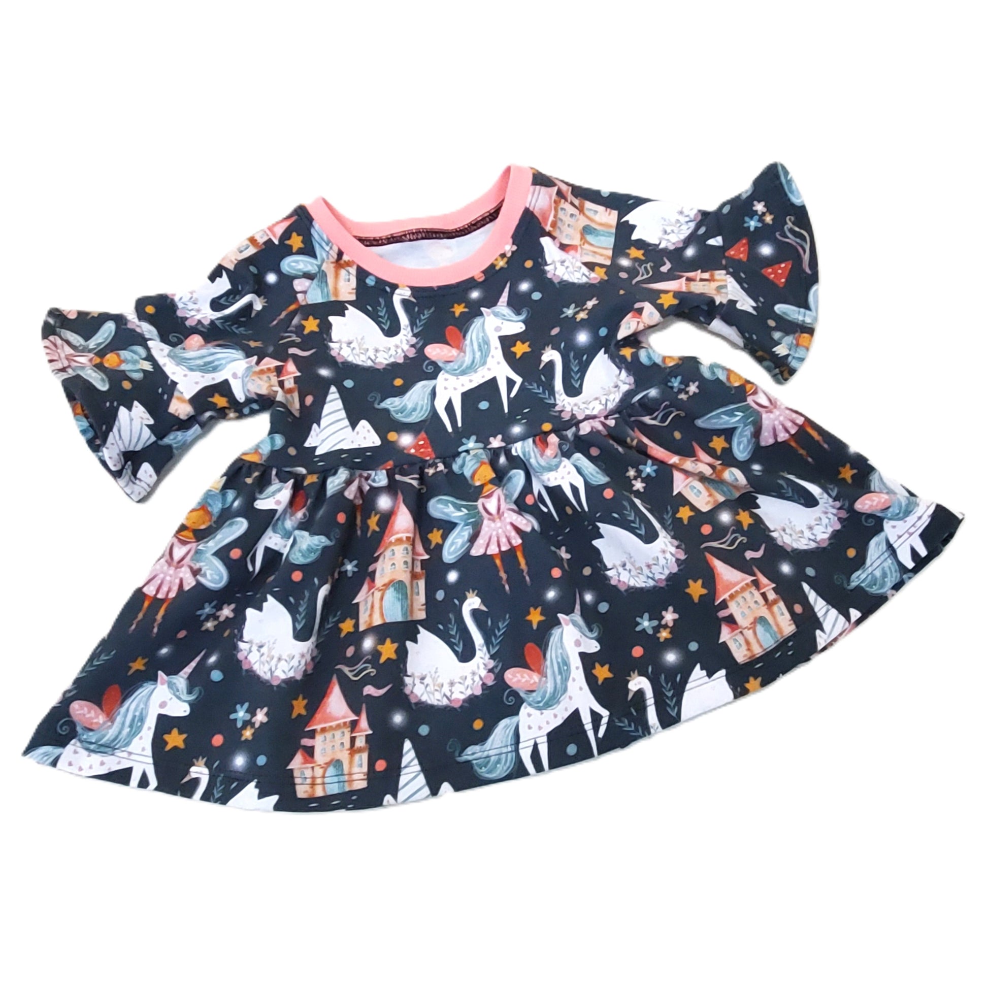 This print has everything you little one could want with unicorns, fairies and castles! This adorable top is a baby doll style with little flutter sleeves. You can pair it with some fun pink flared pants as well if you'd like.