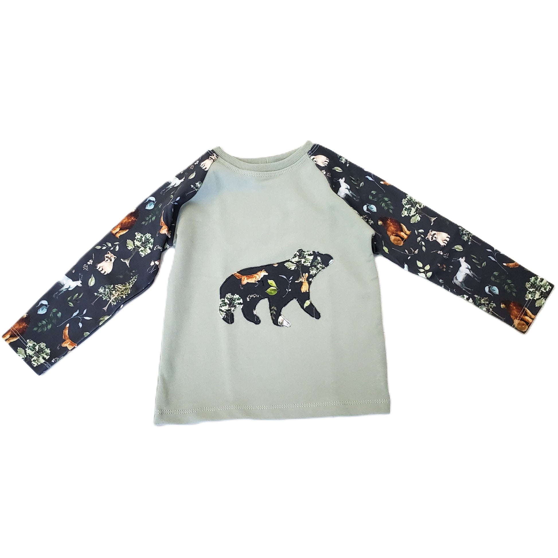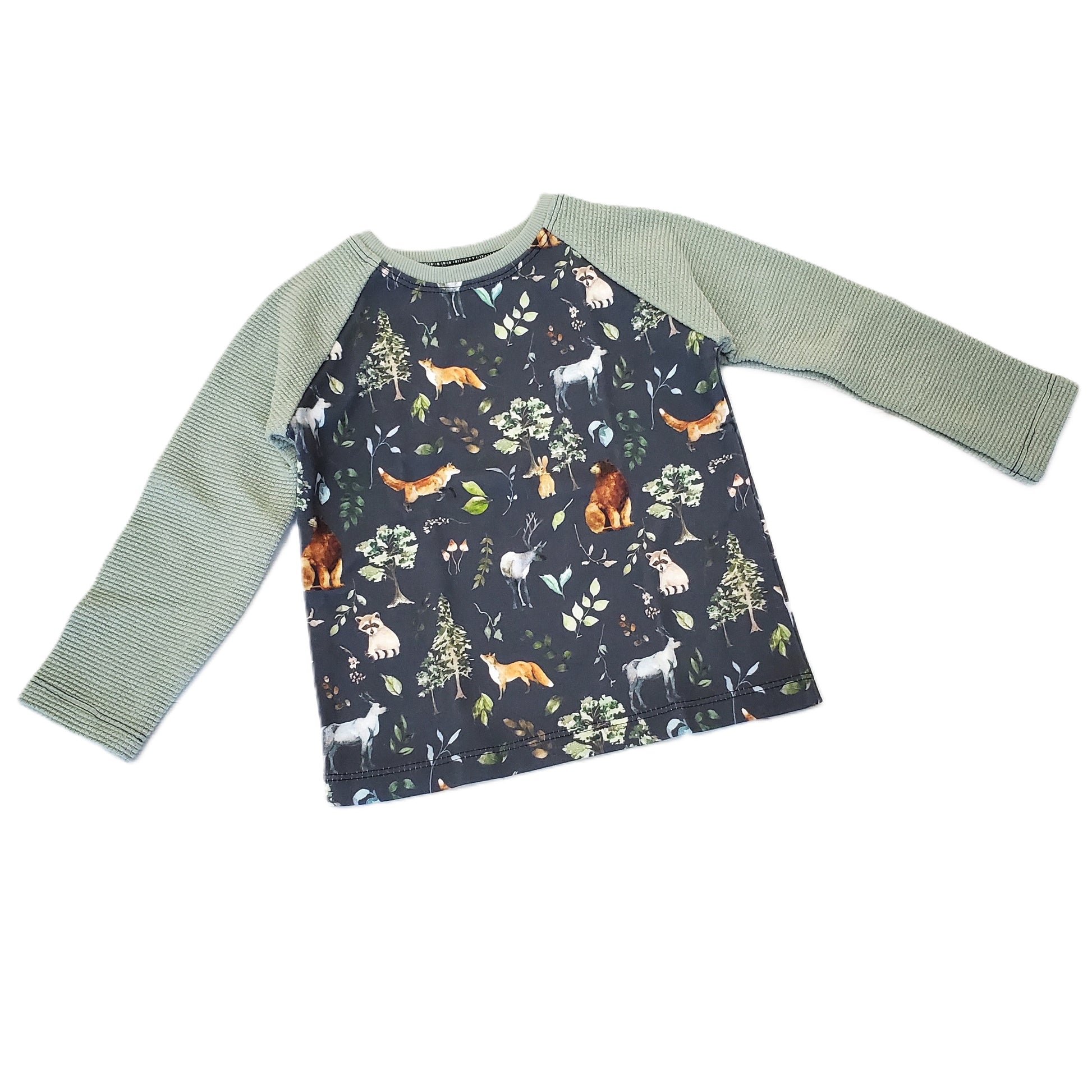 There is a woodland print tee with waffle knit sage green sleeves in 18 months and 2T, a fox applique shirt in 18 months and a bear applique shirt in 3T.